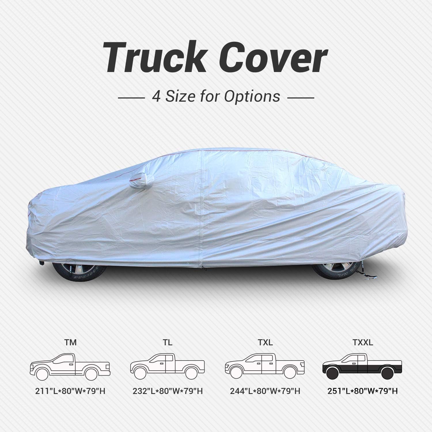 - UNIVERSAL FITMENT - TXXL universal car cover fit for full size truck length up to 252". Compatible with Ford F150 / Chevrolet Silverado 1500 / Ram 1500 / GMC Sierra 1500 crew cab--Standard Bed and it also compatible with Ford F250 / Chevrolet Silverado 2500 / Ram 2500 / GMC Sierra 2500 crew cab--Standard Bed This rain and snow car cover comes with a portable storage bag to keep your auto cover.