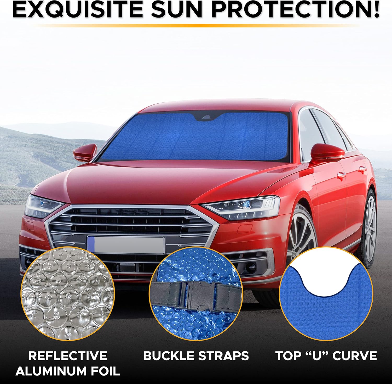 - Compact, Foldable & Space-Saving: Sized at 58 x 28 inches, this windshield cover sun shade fits most standard car windshields. The integrated buckle strap keeps the accordion sunshade compact when stored. It’s the ideal car window shade accessory for everyday convenience and protection.