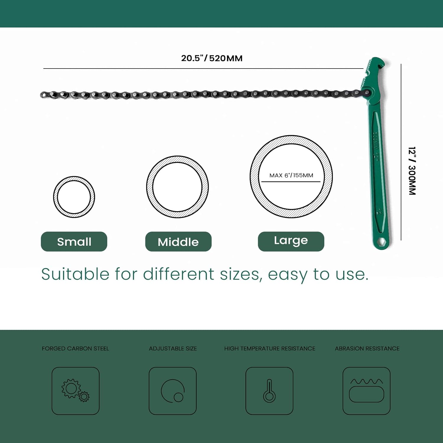 - 【Chain Wrench Size】- Chain Length: 20in/515mm; Handle Length: 12in/300mm. Fits 1.5 inch to 6 inch diameter.