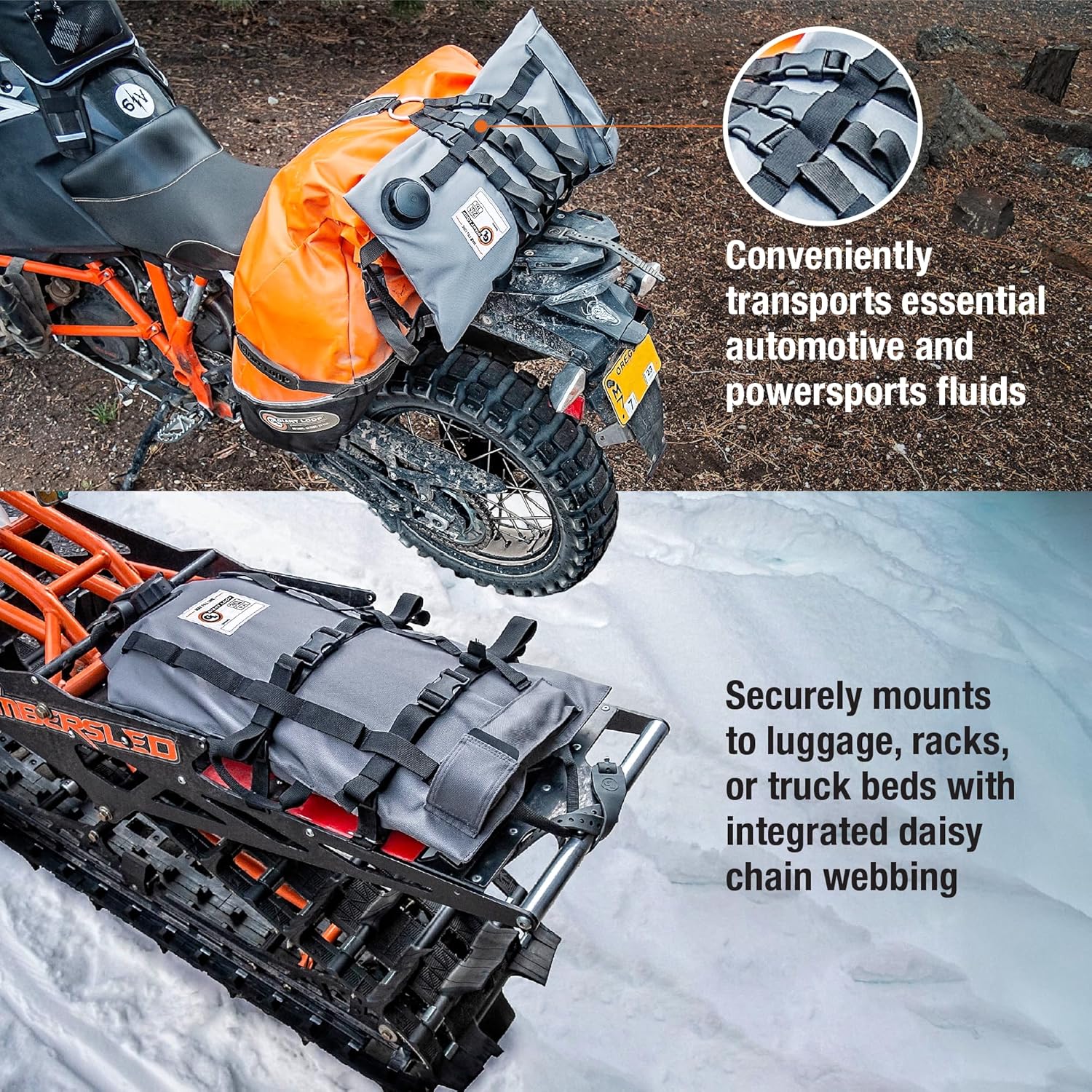 - SAFE TRANSPORT OF AUTOMOTIVE FLUIDS: Giant Loop's Armadillo Bag is a flexible, collapsible, lightweight and portable utility bladder for the safe transport and storage of liquid hydrocarbon products and other powersports and automotive fluids. It rolls up or packs flat when empty, making it convenient to carry around.