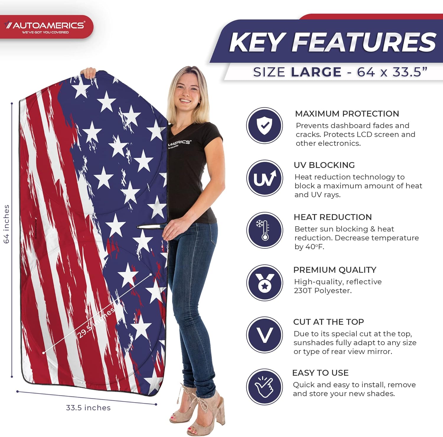 - Market-leading sun protection with an eye-catching American flag design. The new Autoamerics 1 piece USA windshield sunshades combines unbeatable sun reflecting and heat blocking capabilities. We achieve our market-leading protective performance by combining the finest reflective materials and innovative design to reflect the most scorching hot UV rays and heat.