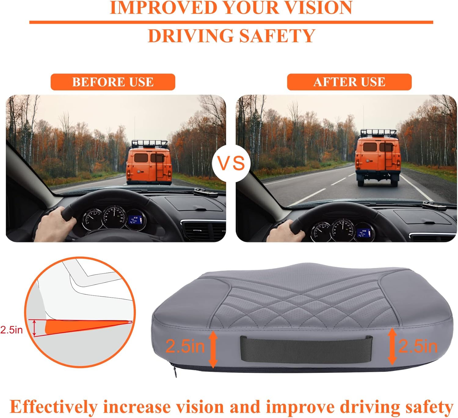 - Expand Driving Vision - The height of the driving position is increased by 2.5 inches, and apparently by using our car seat cushions for driving could expand the vision and help the driver see more clearly. The car seat cushions for short people could also promote right posture and correct spinal alignment for a good driving. We also add a non-slip bottom to keep the car seat pad in place