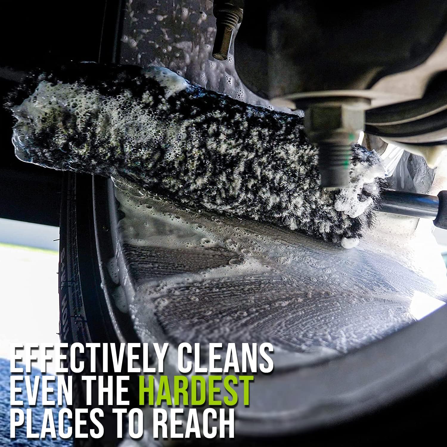 - TOUGH ON GRIME, SAFE ON WHEELS: Don’t risk scratching your wheels just to get them squeaky clean! These bendable brushes are safe for all wheel types. Both are engineered from polypropylene, chemically-resistant thick wool carpet fiber, and the large brush features a smooth rubber tip that removes dirt and grime easily but keeps your wheels’ finish safe and scratch-free.