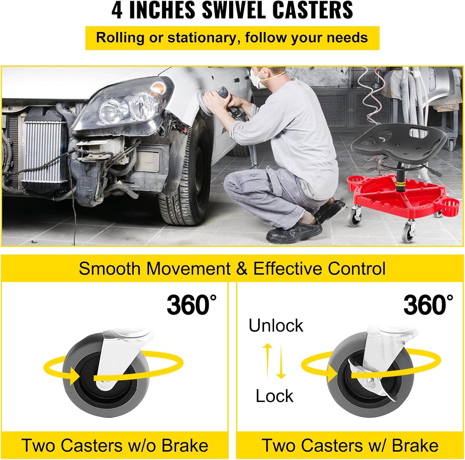 - Durable Casters & Brakes: Our rolling work stool has four 4" swivel casters for maximum mobility. Two casters feature a brake mechanism that assists when working on elevated surfaces. All the casters are made from TPR.