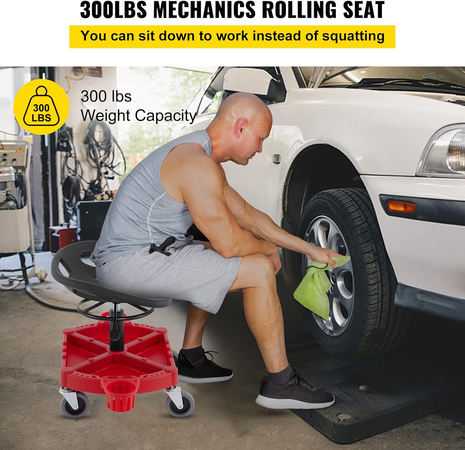 - 300 LBS Rolling Stool: If you're spending lots of time sitting in a garage or shop, it's definitely worth investing in an ergonomic rolling shop stool. The garage stool would be great for any projects that require you to be over a lot. You can sit down and work instead of squatting. This stool makes polishing, wheel cleaning, tire & rubber cleaning, and all other exterior jobs much easier. It saves energy and helps you get the job done faster.