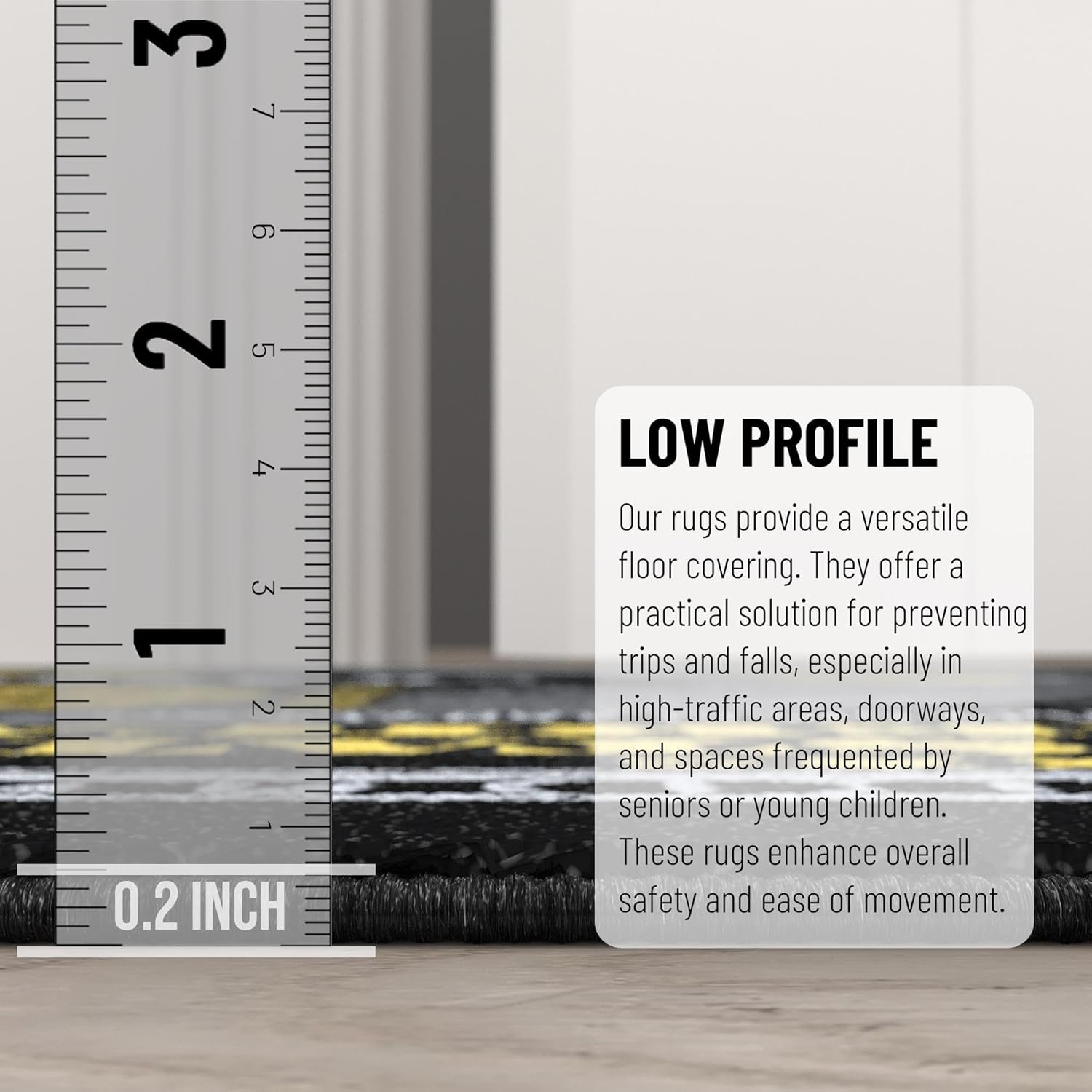 - [ULTRA THIN]: A ultra thin pile thickness of 0.2 inches offers ideal functionality that is perfect for busy areas, underneath furniture, and in entryways as it will not obstruct doorways.