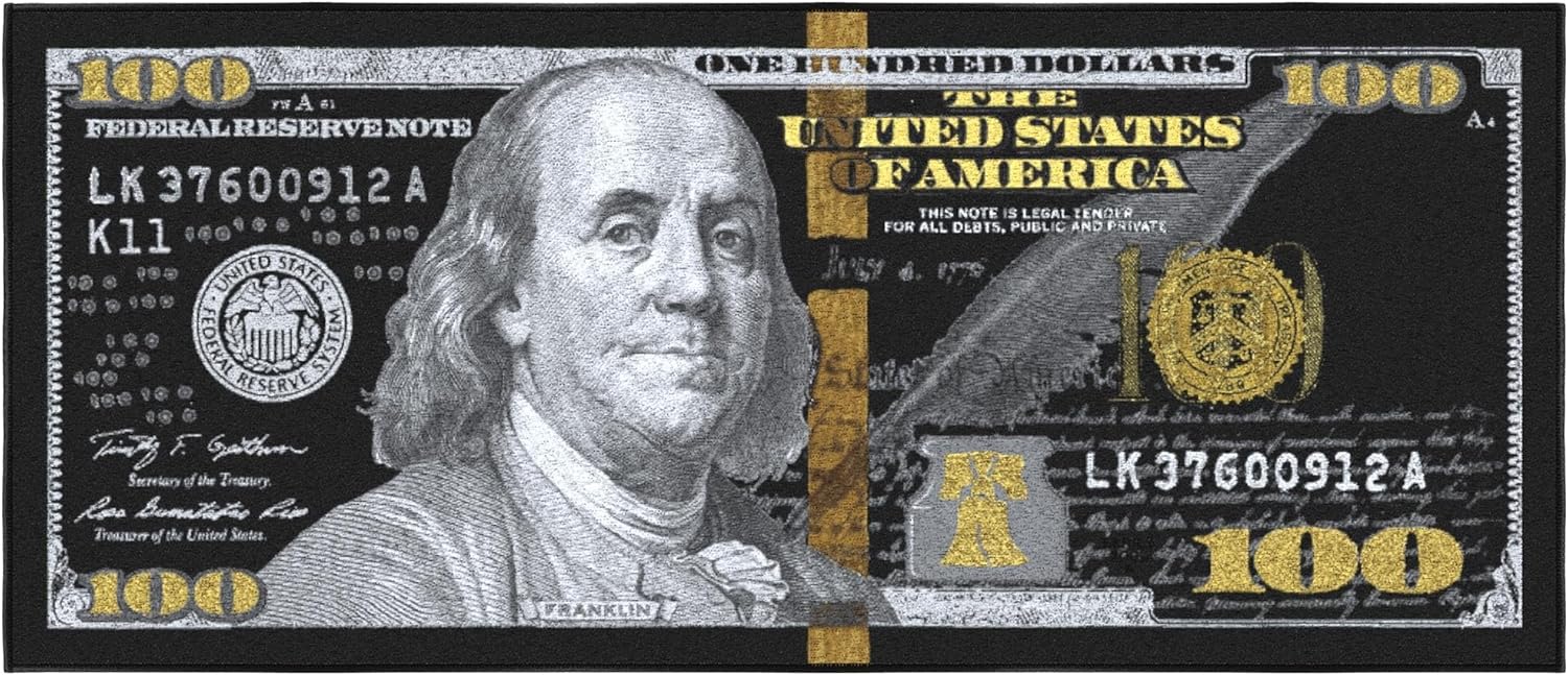 - [TRENDY STYLE]: This Colorful Money Money Rug features a 100 dollar bill print in shades of black, white, and gray with touches of gold while also adding color and enhancing the look of your home. Its timeless design can be integrated into a variety of home décor styles.