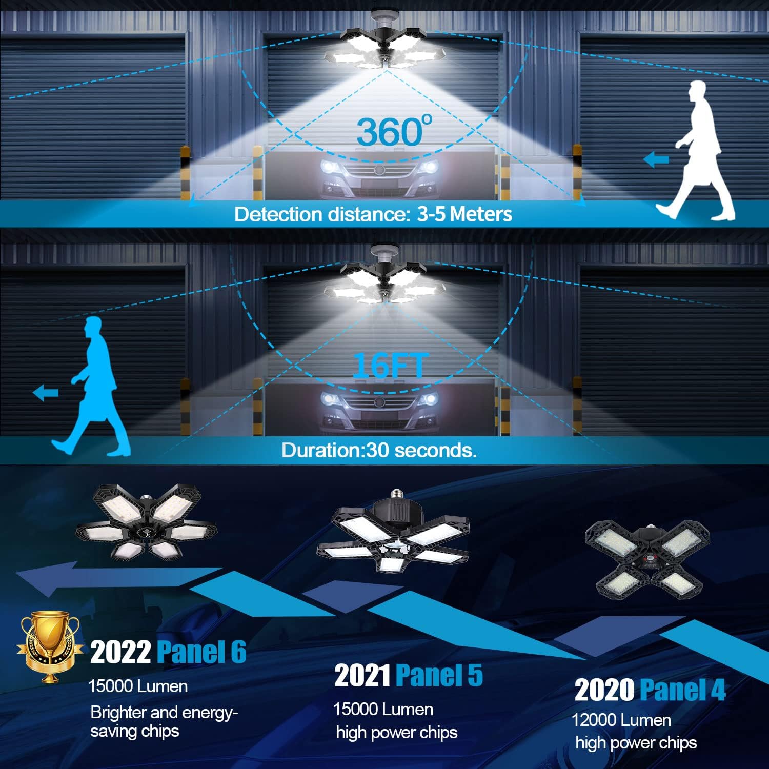 - ✔The World's Leading Deformable LED Garage Lights Technology with 240 Pcs Top Quality Chips. Two garage lights with a total light output is 30000 lumens at 65000K "daylight" for garage.The motion distance is about 10-16ft,sensing angle is 360°.Aiming to provide you a convenient and electricity-saving garage light.The degree of sensing is very sensitive, even through walls, it can sense any movement within the sensing range and then light up.