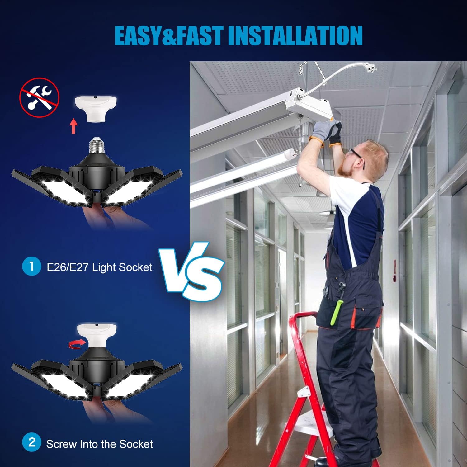 - ✔【Deformable Design Ultra Bright LED Garage Lights】Multi Function Design: 6 light panels can be adjusted on the garage light to expand the illumination range. Each wing is adjustable by 90° and 360°light cover area,powerful LED modules with an output of 15000lm, keeps your room bright but saving 80% energy bill.This 150 watts LED garage light bulb is equivalent to two 300 watts incandescent bulb.
