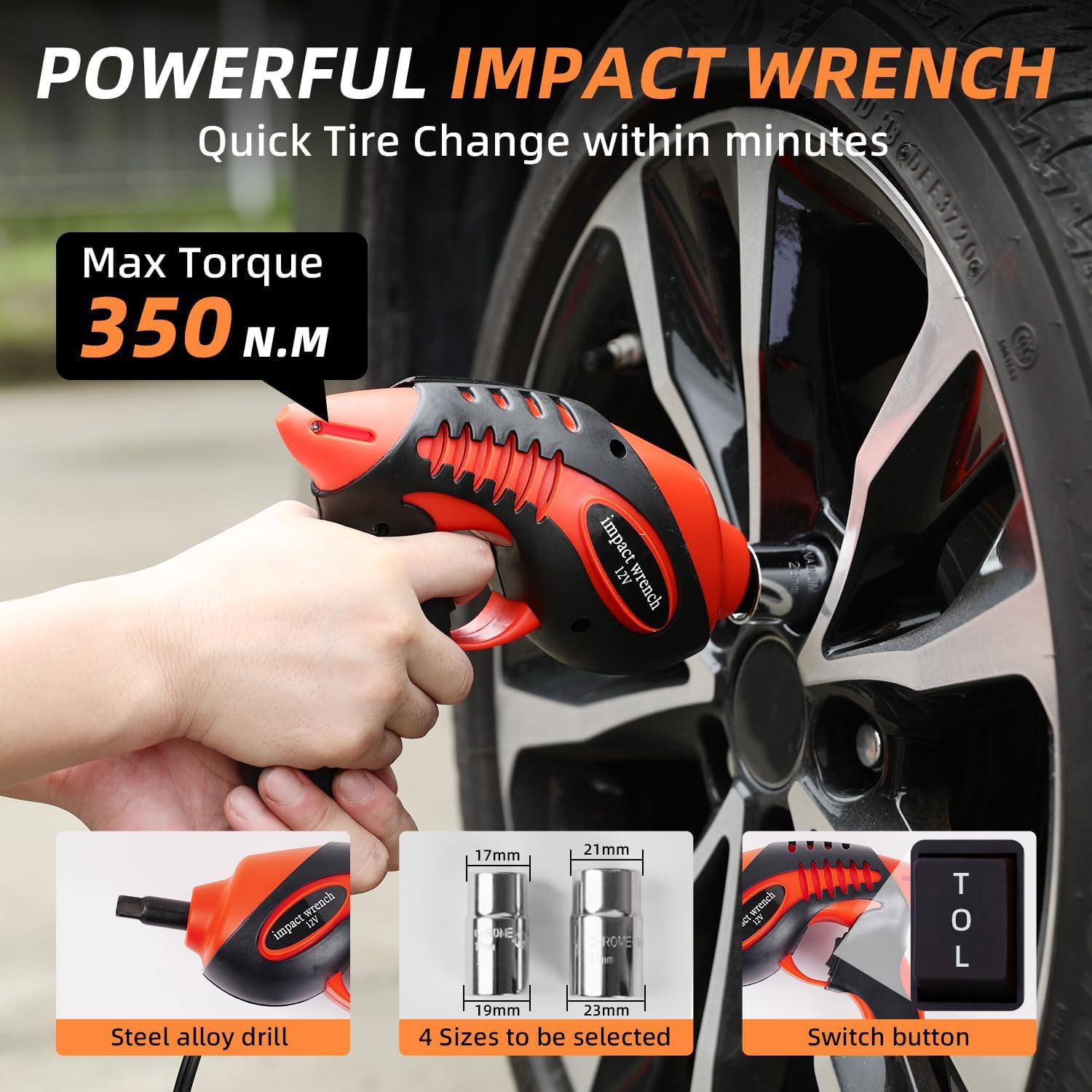 - High-Torque Impact Wrench: This electric jack features a 350N.M wrench with dual sockets . A powerful motor enables quick lug nut removal and 360° rotation