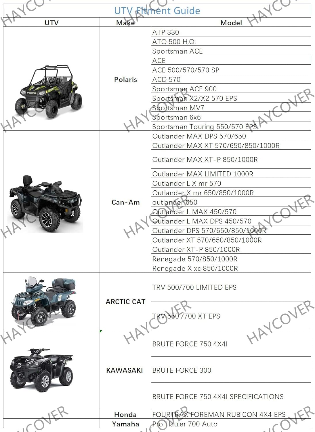 - Material Oxford, Polyvinyl Chloride : Vehicle Service Type Sport ATV / Utility ATV / Youth ATV, Honda, Yamaha, Polaris, Suzuki, Kawasaki, Can-Am, Arctic Cat,KTMSport ATV / Utility ATV / Youth ATV, Honda, Yamaha, Polaris, Suzuki, Kawasaki, Can-Am, Arctic Cat,KTM See more Sport ATV / Utility ATV / Youth ATV, Honda, Yamaha, Polaris, Suzuki, Kawasaki, Can-Am, Arctic Cat,KTMSpo… See more