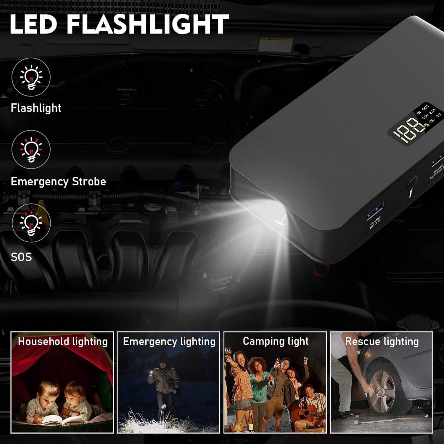 - 🚗【3-IN-1 LED Flashlight】 - The portable battery jumper starters has a built-in LED flashlight with 3 modes (Lighting/Strobe/SOS) for emergency and outdoor adventures.