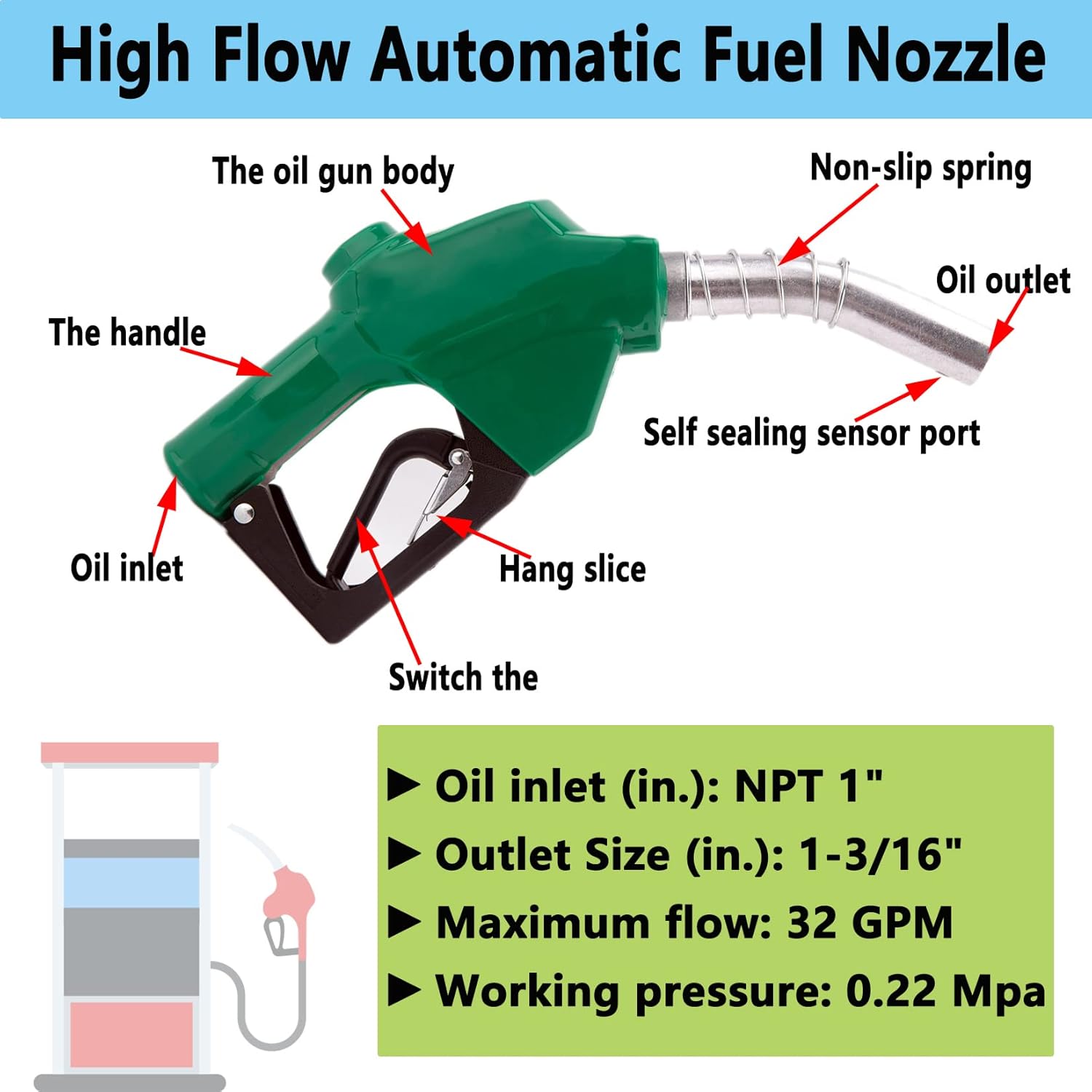 - Automatic Fuel Nozzle Technical Parameter:Inlet Thread Size (in.) : 1" NPT , Outlet Size (in.): 1-3/16''.Flow Rate: 32 GPM.You can easily fill up a tank in minutes.It has the characteristics of large flow, simple operation and convenient use, and is especially suitable for emergency refueling or refueling of oil tankers.