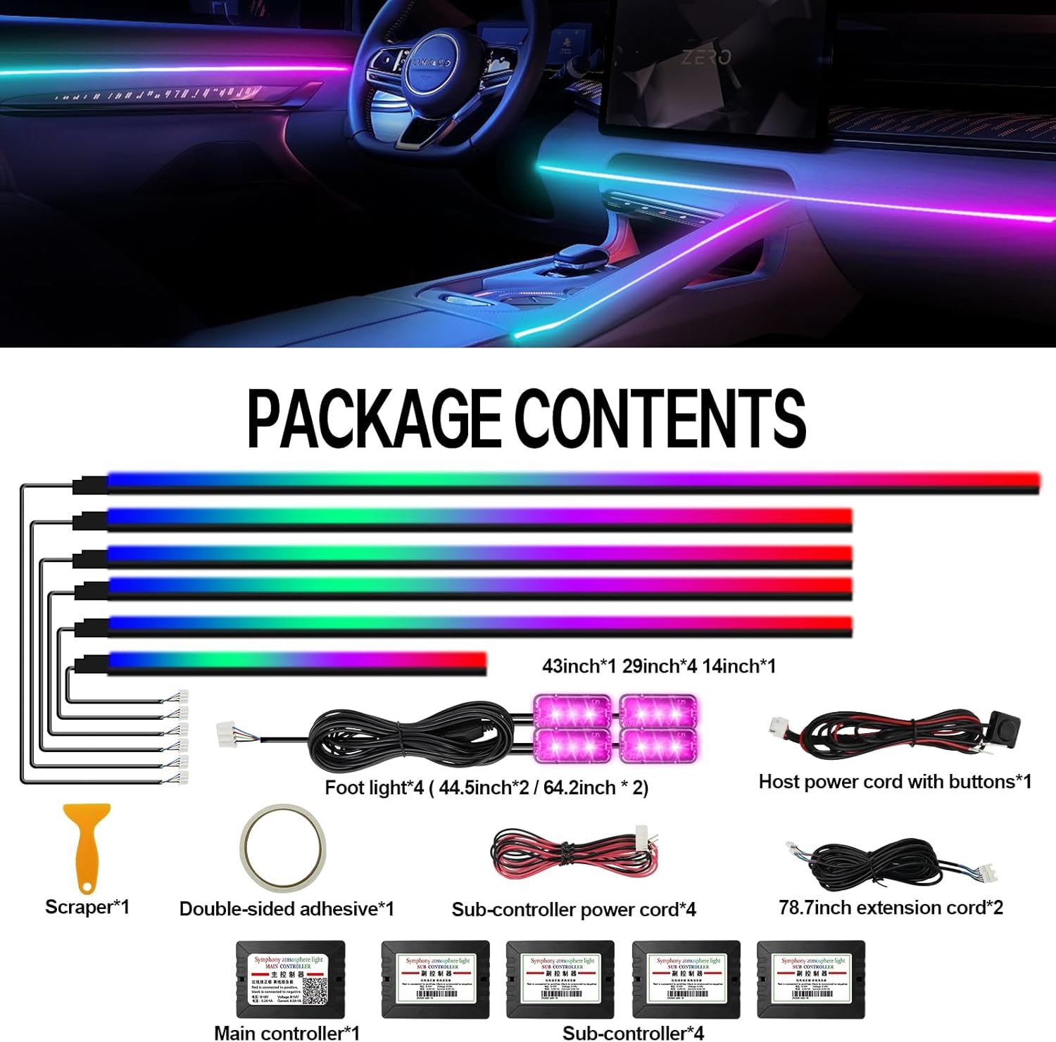 - Included Components : 1 master controller, 4 slave controllers, 6 acrylic fiber optic light strips, 4 under dash lights
