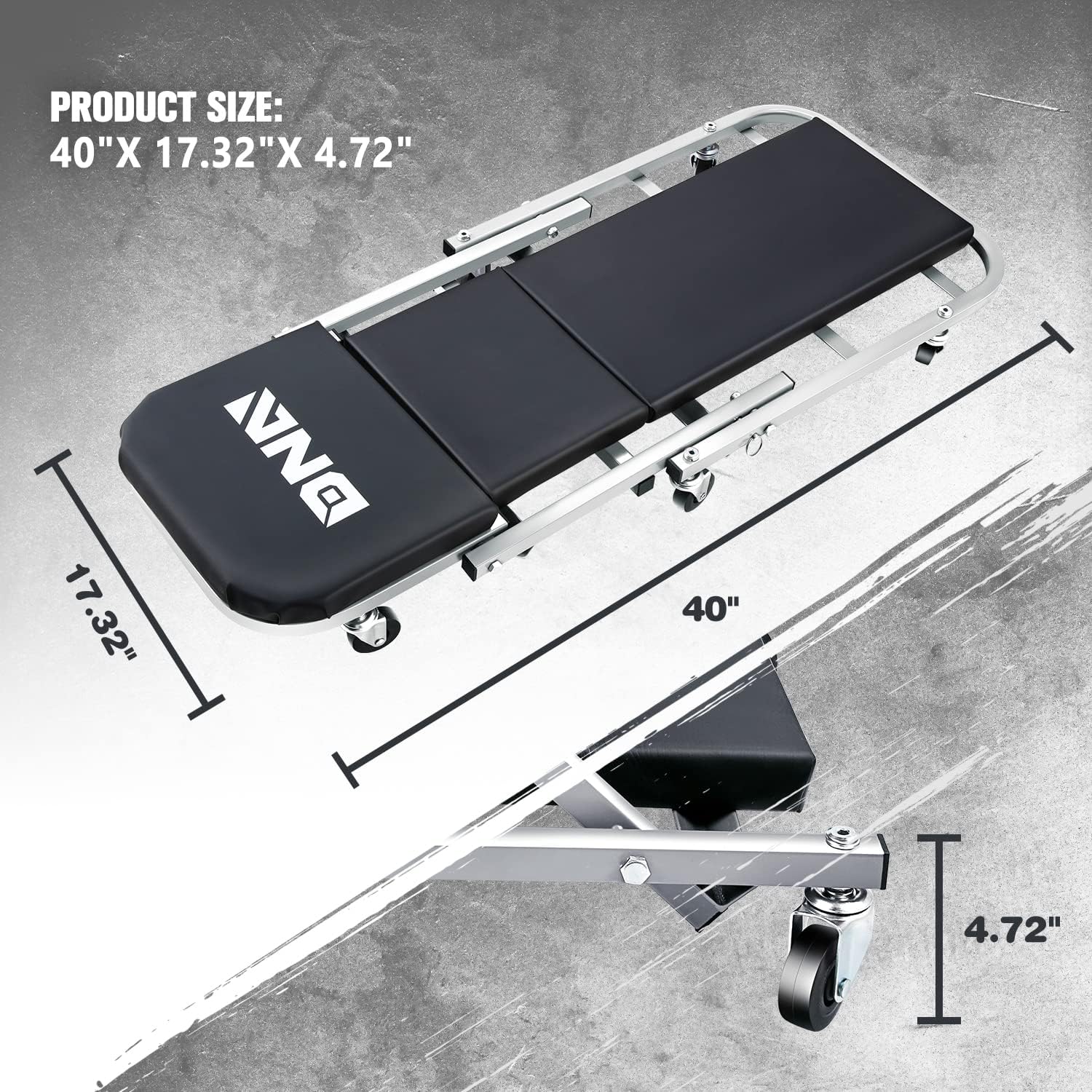 - PRODUCT SPECIFICATIONS - The car creeper/seat has a maximum weight bearing capacity of 150KG. It measures 40'' long, 17.32'' wide, and 4.72'' high; Allows you to work in your garage or workshop in comfort.