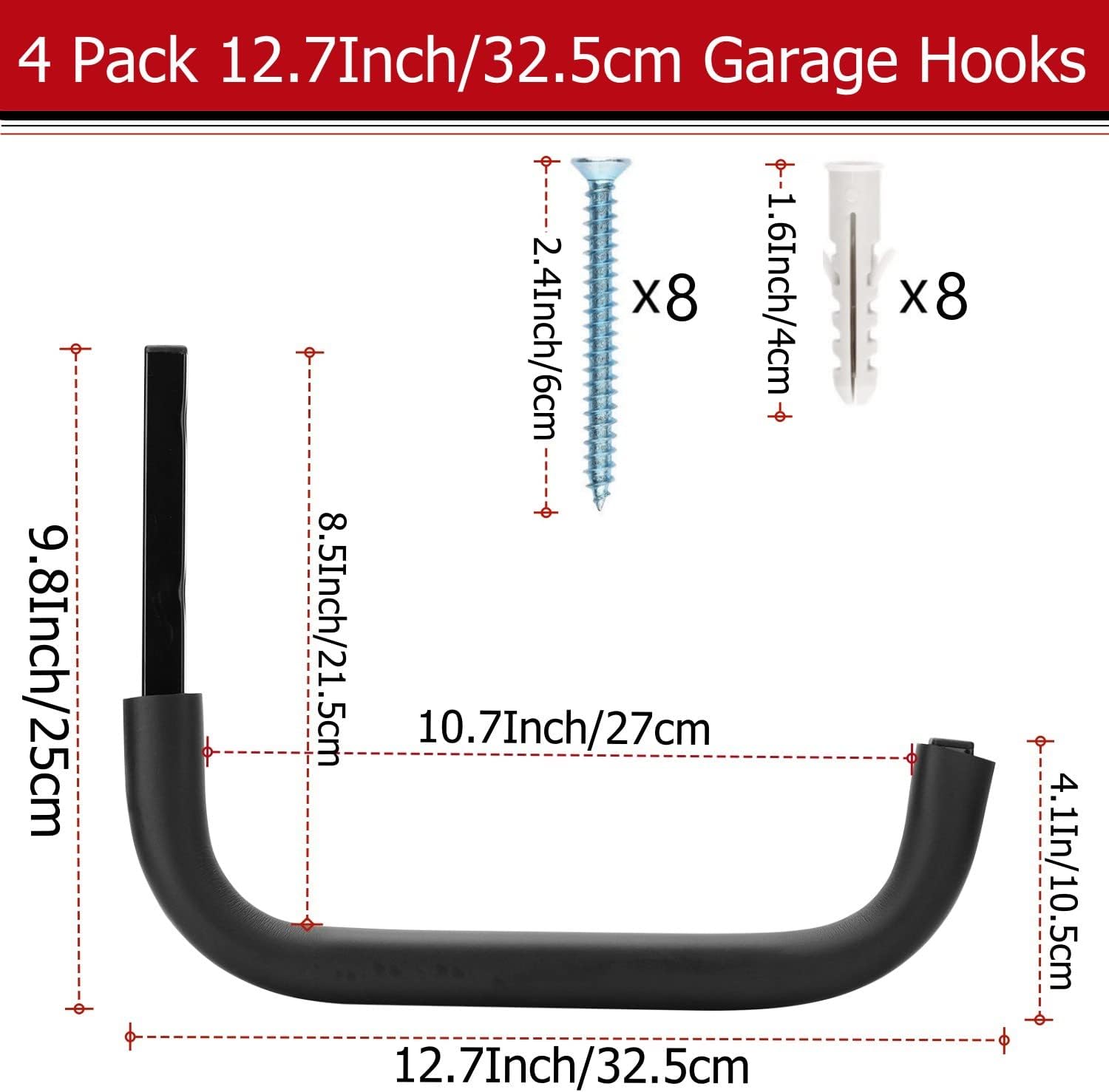- EASY INSTALLATION: 4 pack 12.4Inch utility hook with 8pcs mounting screws and 8pcs plastic anchors, these hooks can be firmly mounted to drywall, wall stud and other type walls, easily and quickly. Our anchors, only suitable for hardwood and common walls.