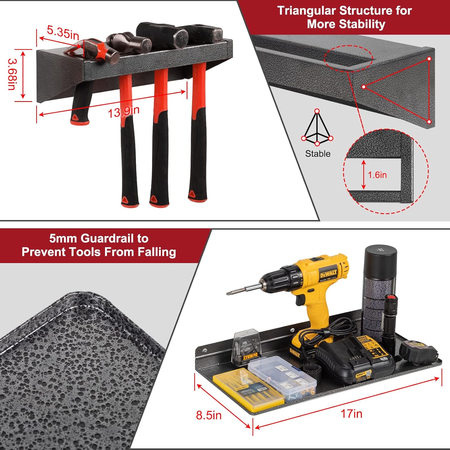 - Strong and Durable: Compared with wooden tool storage racks, our metal tool storage racks are more durable, will not rot and crack, rust-proof, and have a strong load-bearing capacity. The surface is treated with a spotted pattern, which is more beautiful.