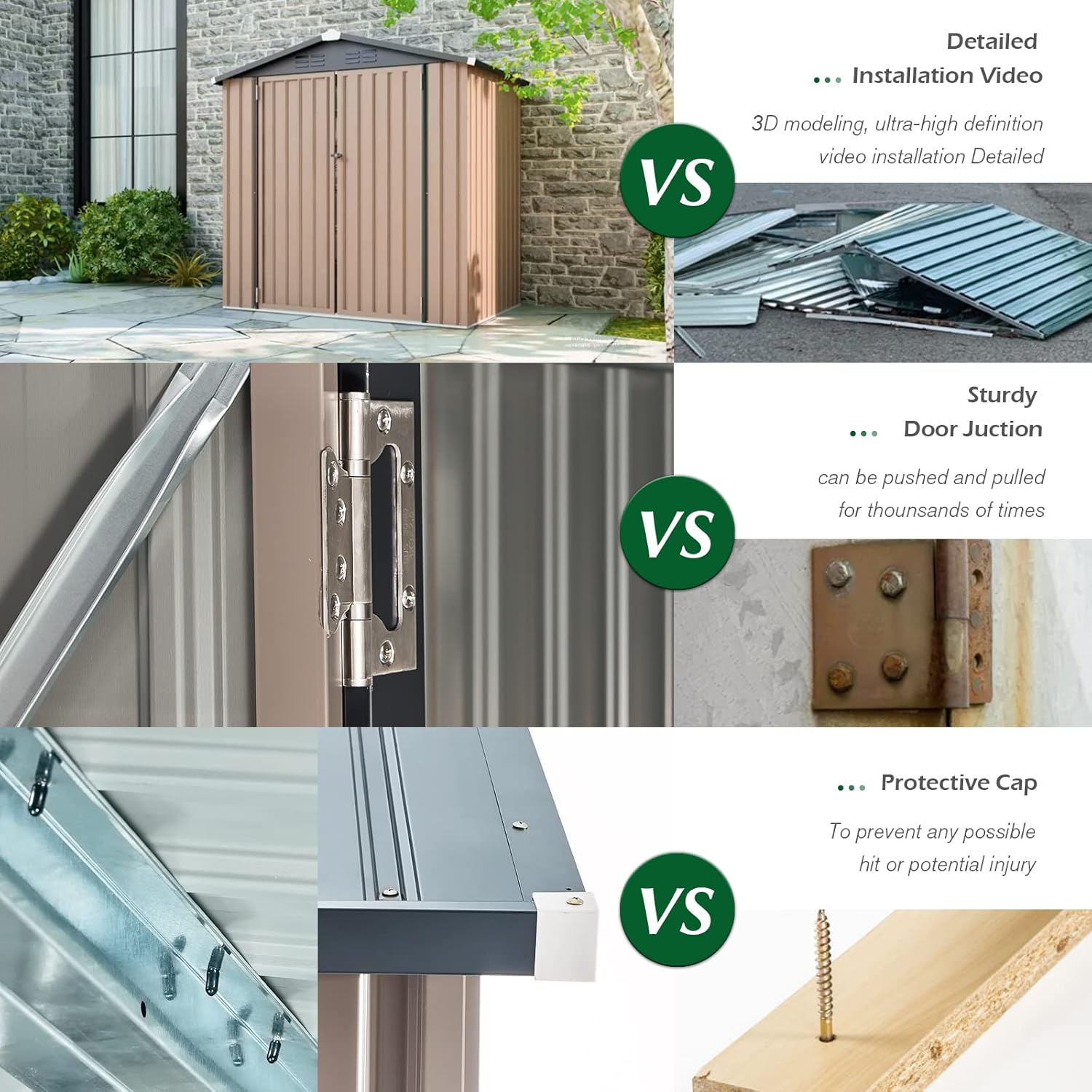 - 【Excellent designed to be more reliable】: After long-period research and survey, we rigorously designed the sloping roof for all three sizes of sheds, to avoid water reserve under heavy rainy days. Special design of air vents to prevent any lack of air inside, plastic caps to avoid injury while people's around. Sturdy and reinforced interior structure to make the shed withstand as long-lasting.