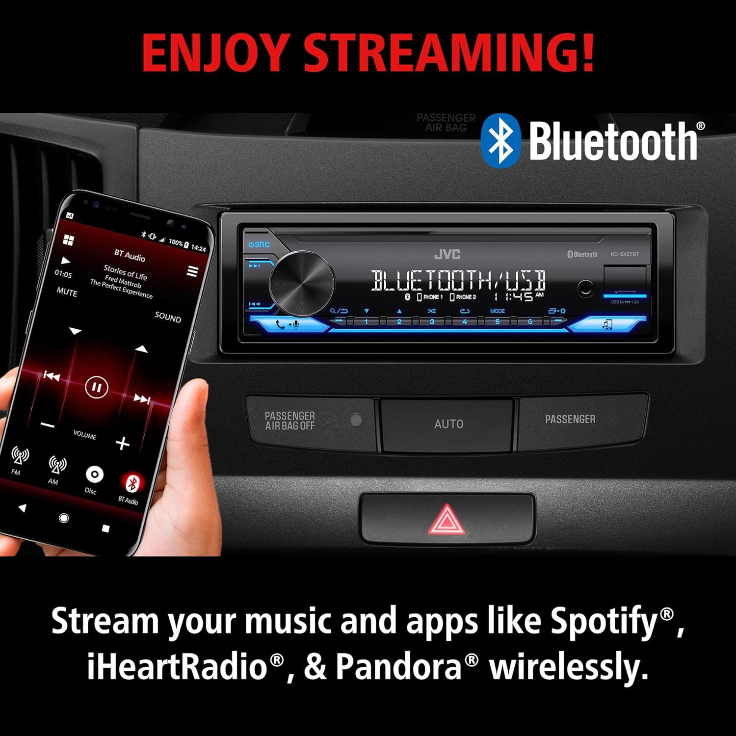 - WIRELESS DIGITAL MEDIA RECEIVER: JVC KD-SX27BT Car Stereo Receiver integrates easily into a wide range of vehicles and lets you stream music from popular music apps like Pandora & Spotify wirelessly via Bluetooth, or play stored tracks on your device
