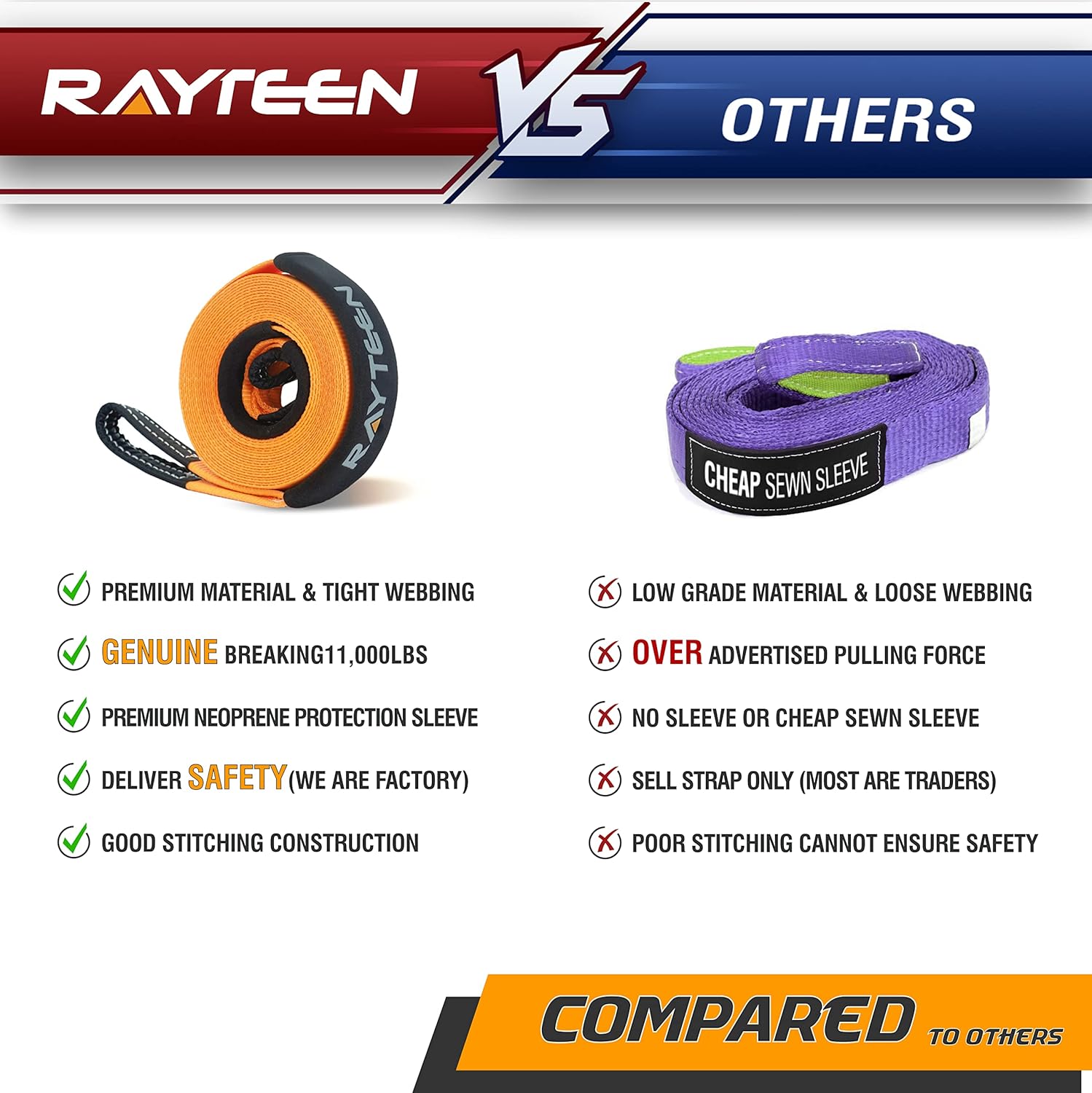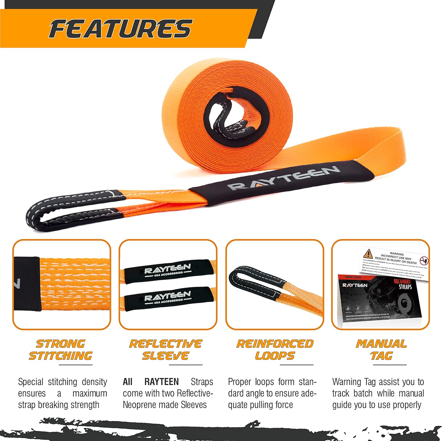 - 【SUPERIOR MATERIAL】All RAYTEEN recovery tow ropes are manufactured by ALL-NEW premium polyester to ensure its performance and users’ safety while other brands use second hand material and over advertise up to 50% of its break strength.