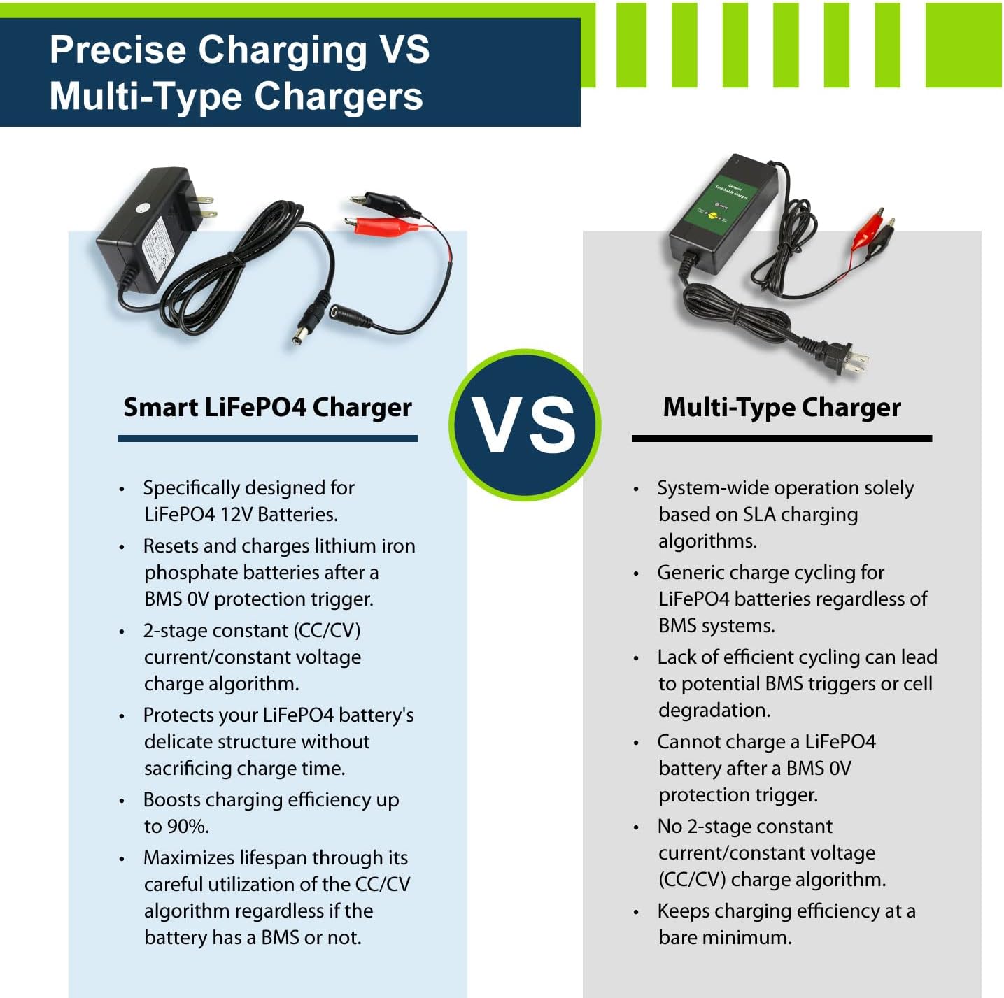 - Efficiently Easy : The charger protects your LiFePO4 battery's delicate structure by boosting charging efficiency and maximizing lifespan through its careful utilization of the CC/CV algorithm regardless if the battery has a BMS or not