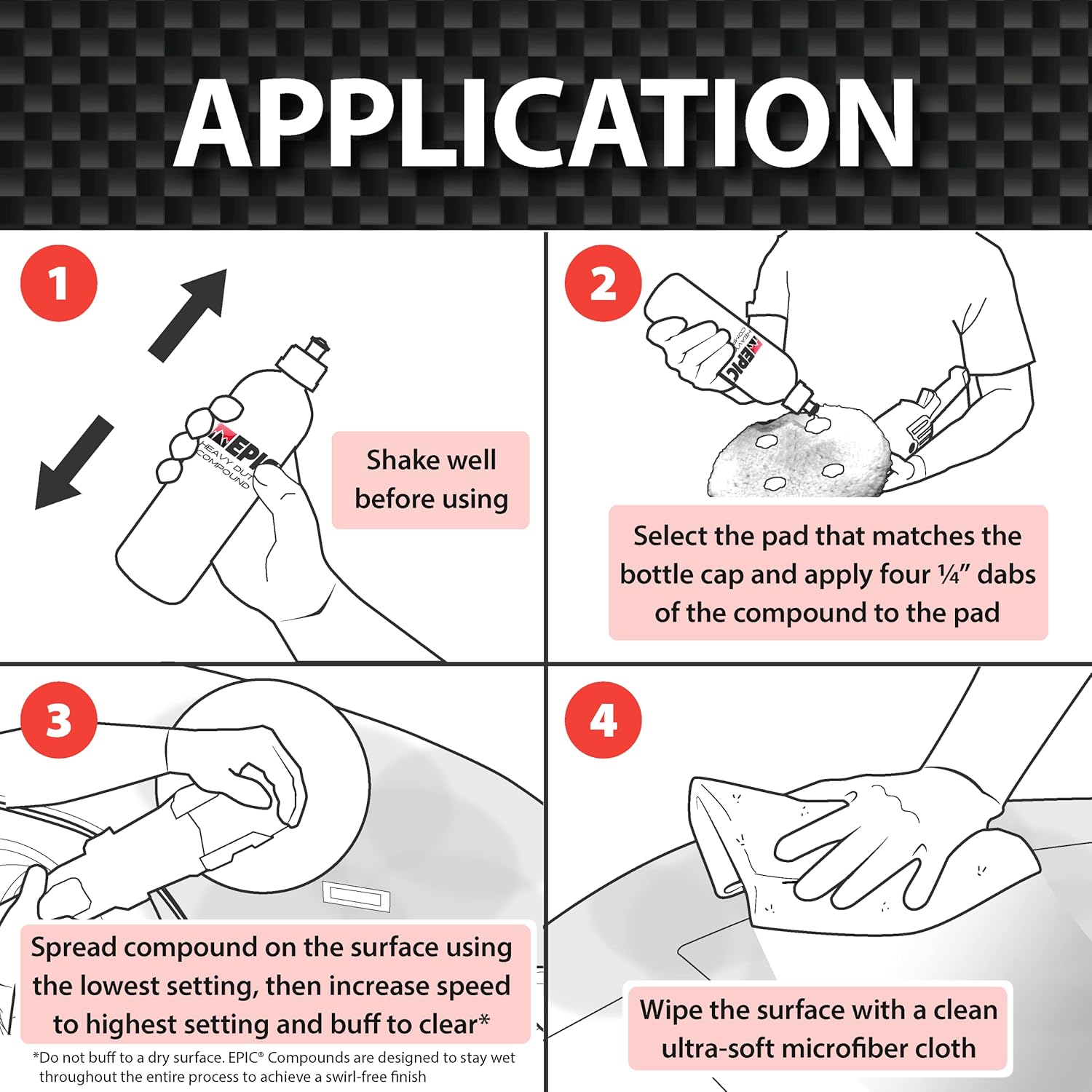 - USE WITH SPECIFIC ORBITAL PADS: For optimal results, apply this car buffing compound with the EPIC Purple Wool Heavy Duty Pad 6.25" or the EPIC Gray Foam Heavy Duty Pad 6.5". These specific pads are designed to work seamlessly with our compound, providing a flawless finish. If you don’t have the EPIC pads, any high-quality, high-density foam buffing pad will also work, allowing you to achieve professional results with the right tools.