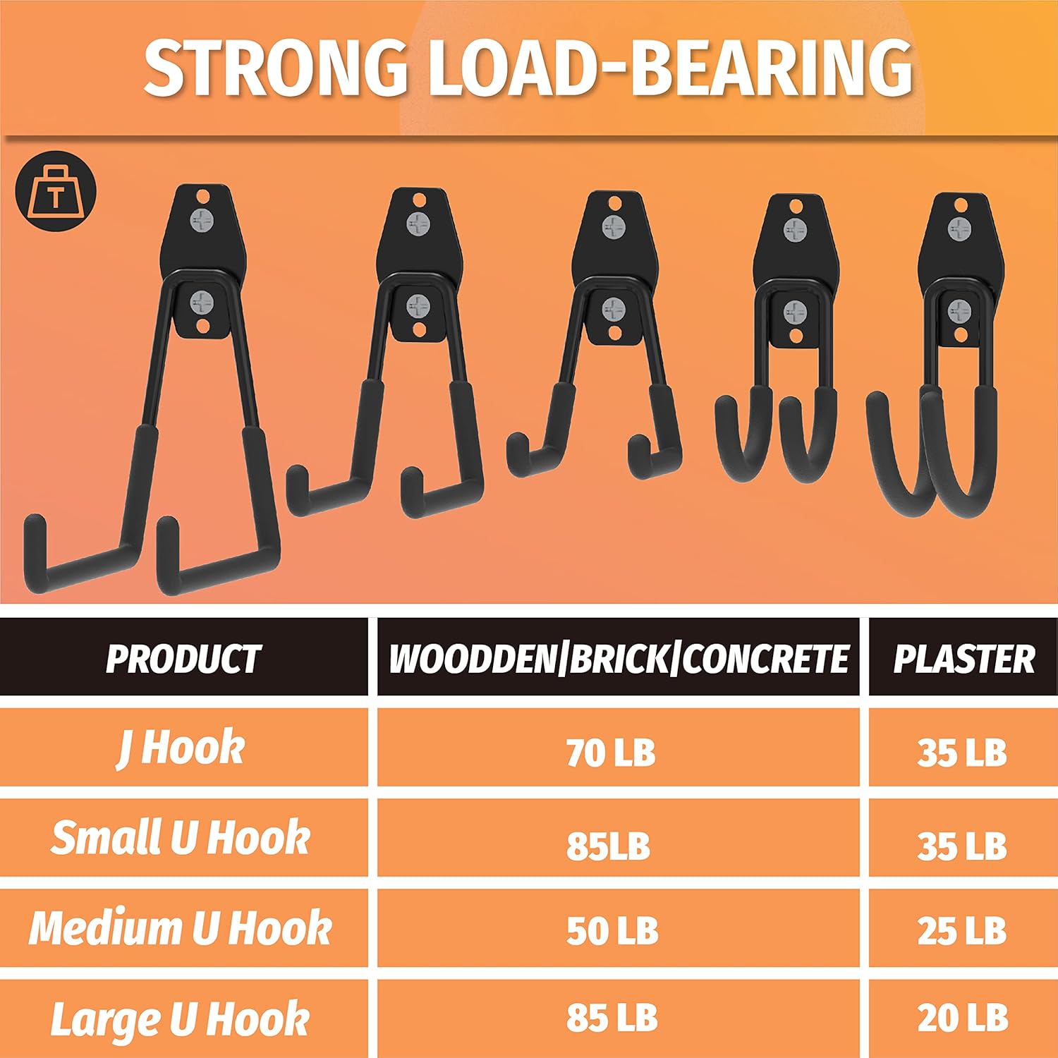 - Multi-Functions: 5 type/size of garage hanging hooks and 2 extension straps are designed to fit all your needs. Our garage storage hooks can store a variety of items such as garage tools, power tools and other heavy duty equipment on various walls like brick, concrete, wood or plaster board, etc.