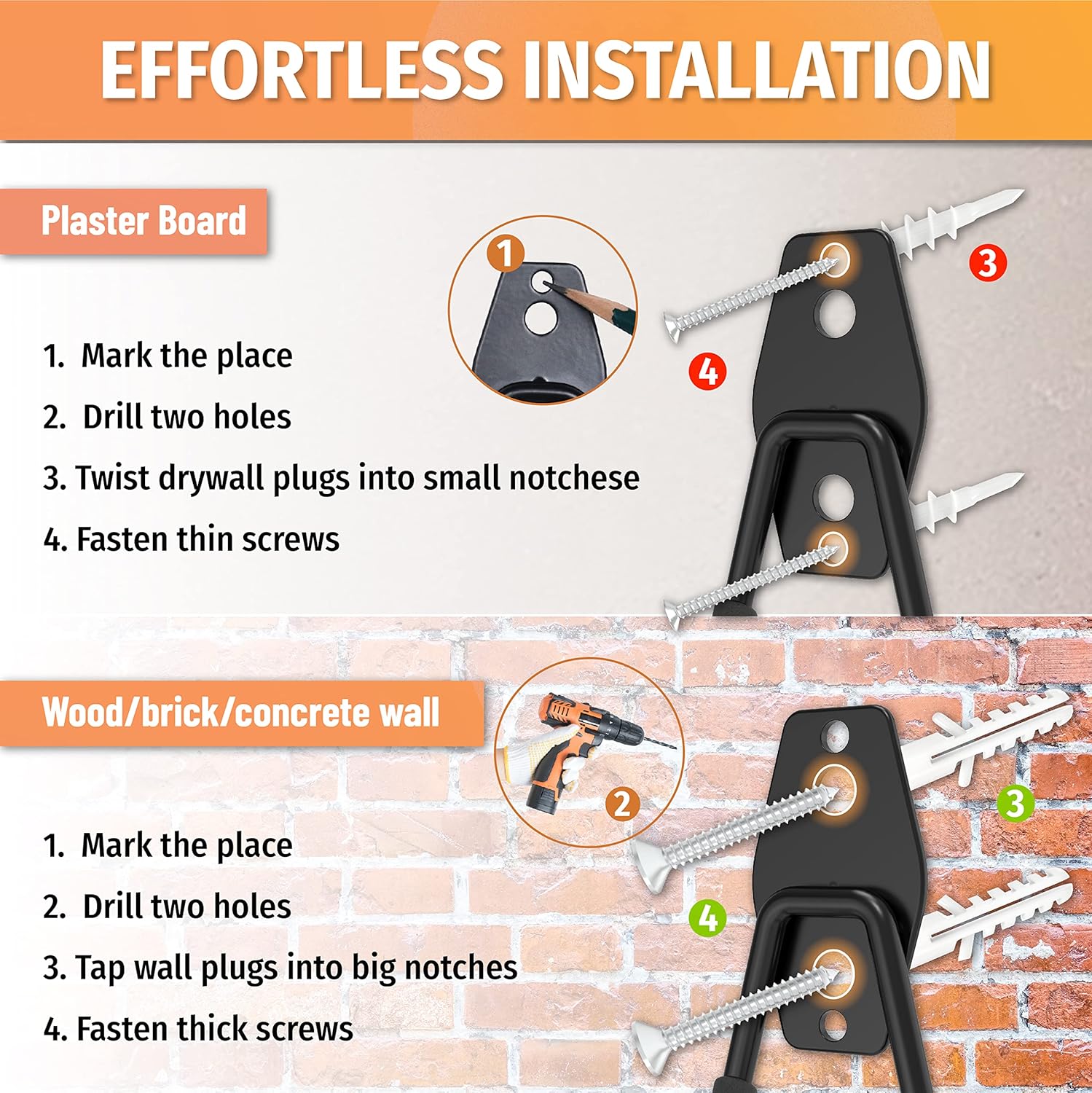 - Easy Installation: Our garage hooks for hanging adapt 3 different anchors to fit various walls. So only with a drill and a screwdriver, you can easily wall mount our ladder hooks for garage wall on wood, brick, concrete wall and plaster board, etc.