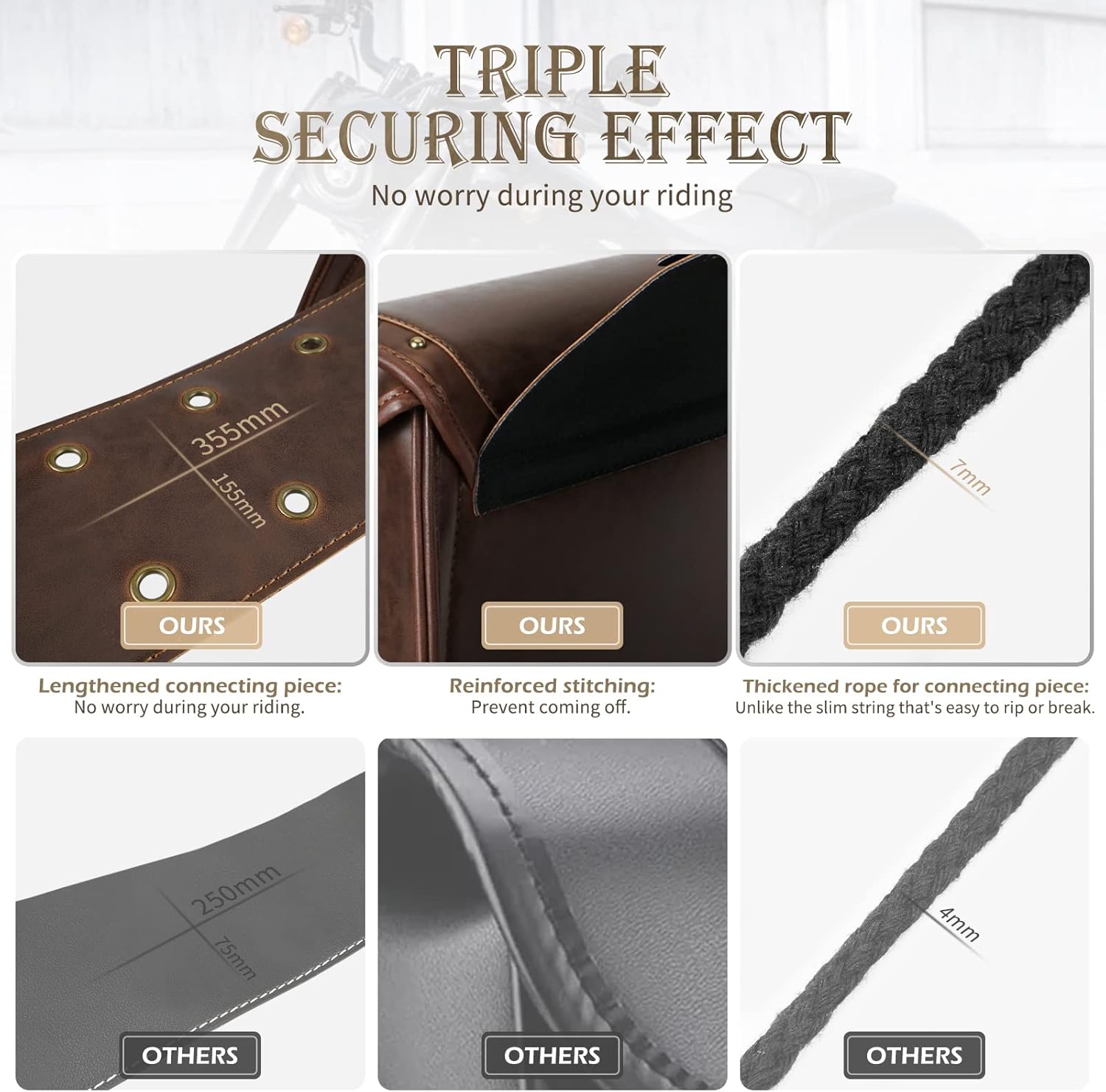 - ★【Strengthen Stability】: To improve adjustability & durability, our motorcycle leather saddlelbags use reinforced extended saddle piece and thickened rope, this will compatible with most size of rear seat,and effectively keep stable at high speed riding.