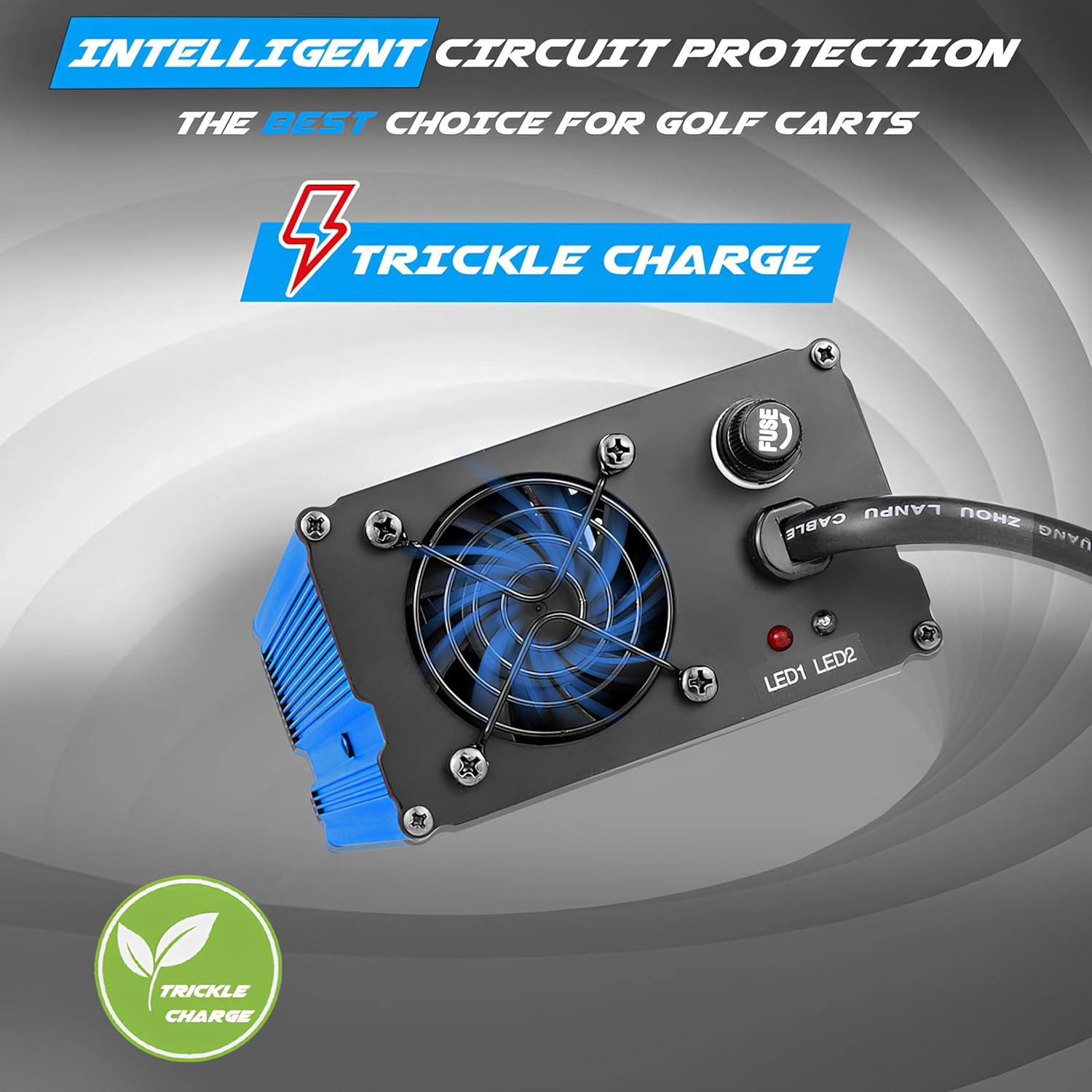 - 【TRICKLE CHARGE&SAFE CHARGE⭐】After 48 volt golf cart charger is fully charged, the charger enters trickle charge mode with the green light on.It will automatically turn back on to charge if the battery level falls below a certain level. The charger for golf cart will adjust the charging power according to the battery level to protect your battery. When charging is abnormal, the fuse of the ezgo charger will automatically disconnect to stop charging. Just replace the fuse to keep the charger working.