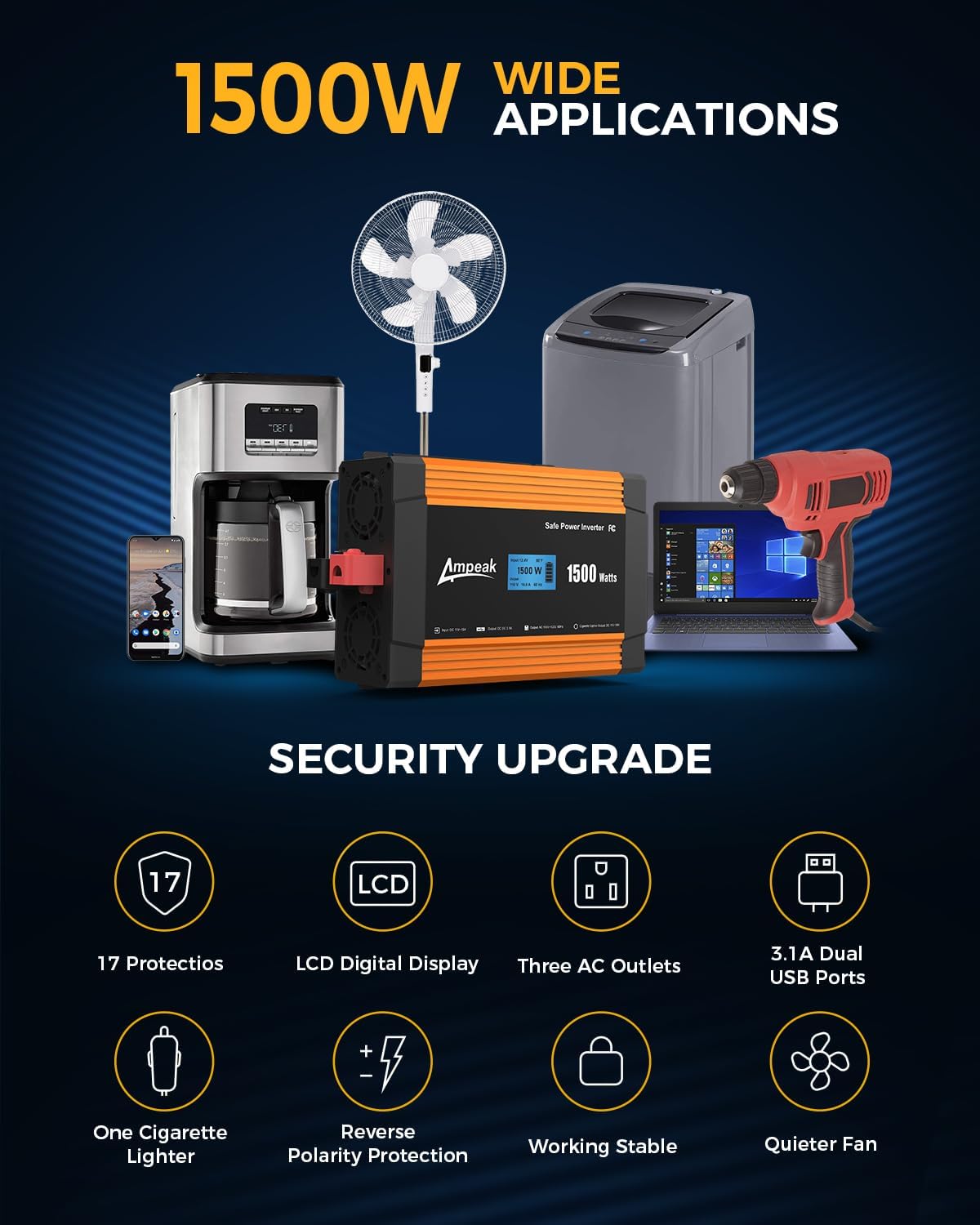 Ampeak 1500W Power Inverter 6.2A Dual USB Ports 3AC Outlets Inverter DC 12V to AC 110V Cigarette Lighter Port 17 Protections for Outdoor Activities, Emergency, RV