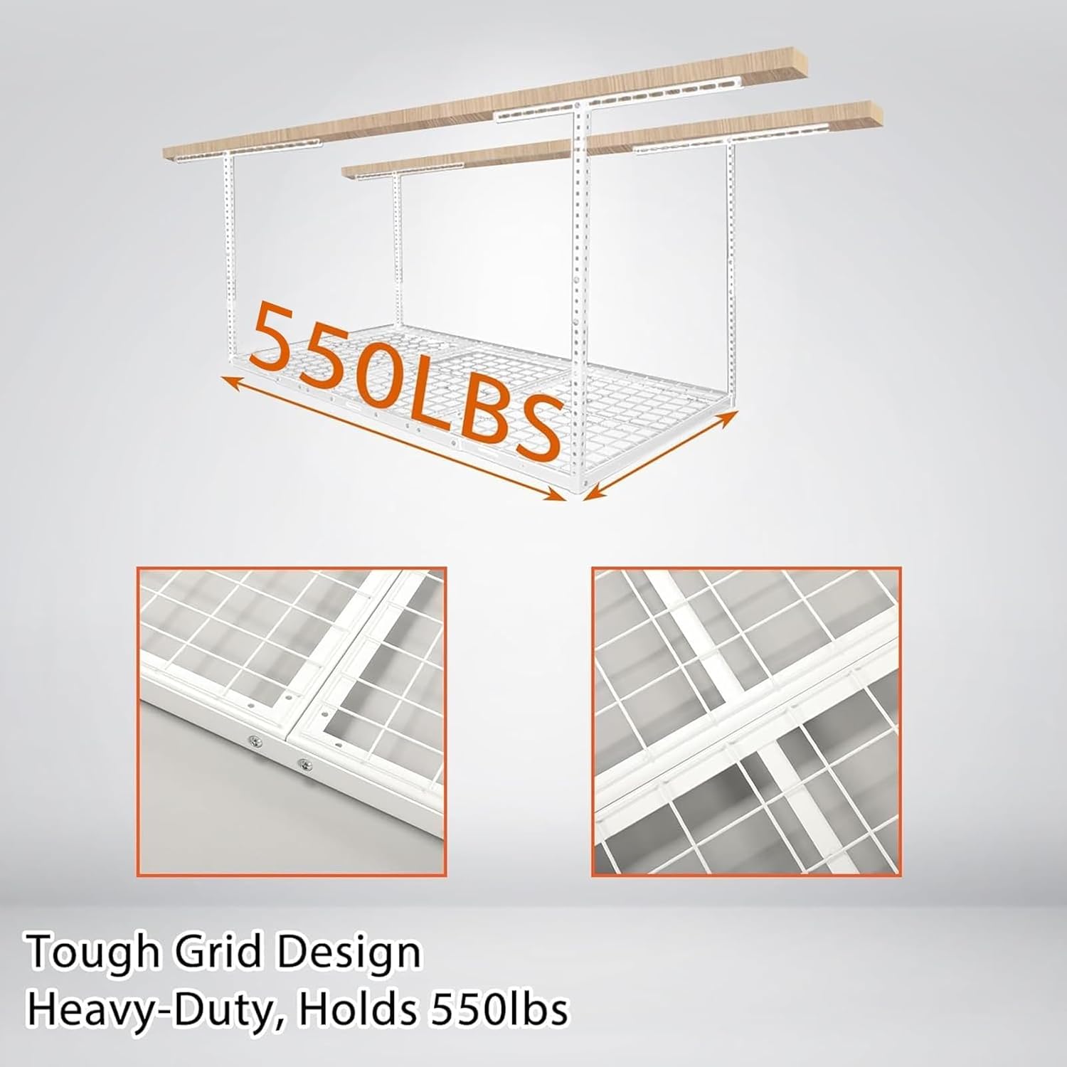 - Design: Designed to help make use of wasted space in the garage. The grid design is more stable and sturdy compared to other products. Heavy duty steel construction can hold up to 550lbs.