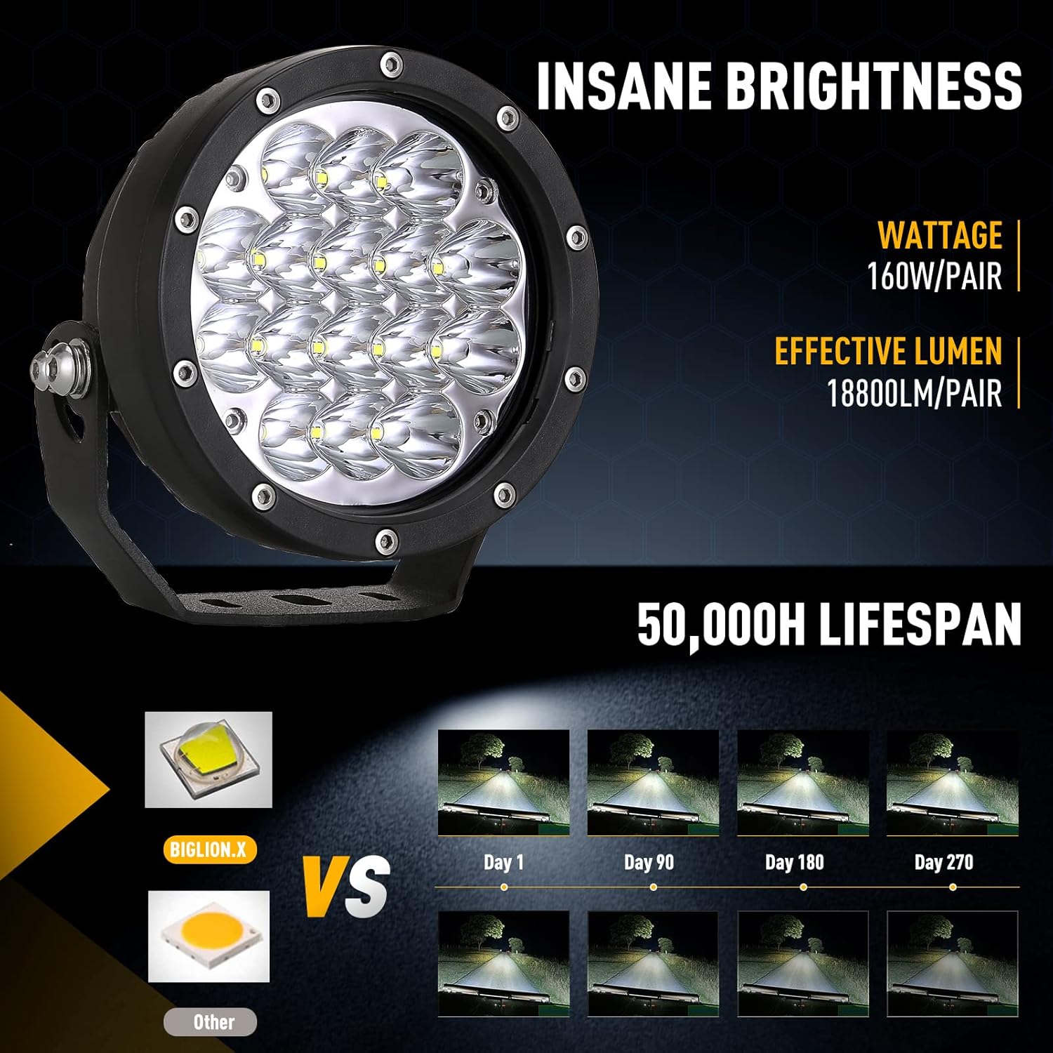 - 【High standard waterproof grade】Products conform to IP68 and IP69K standard. Applied military breather design to prevent condensation and fogging. Lengthen the product life. Balance offroad lights’ differential pressure to achieve thermal balance is attained. Let the sealed lamp beads have better heat dissipation. Enhance the usage of reliability in extreme environment.