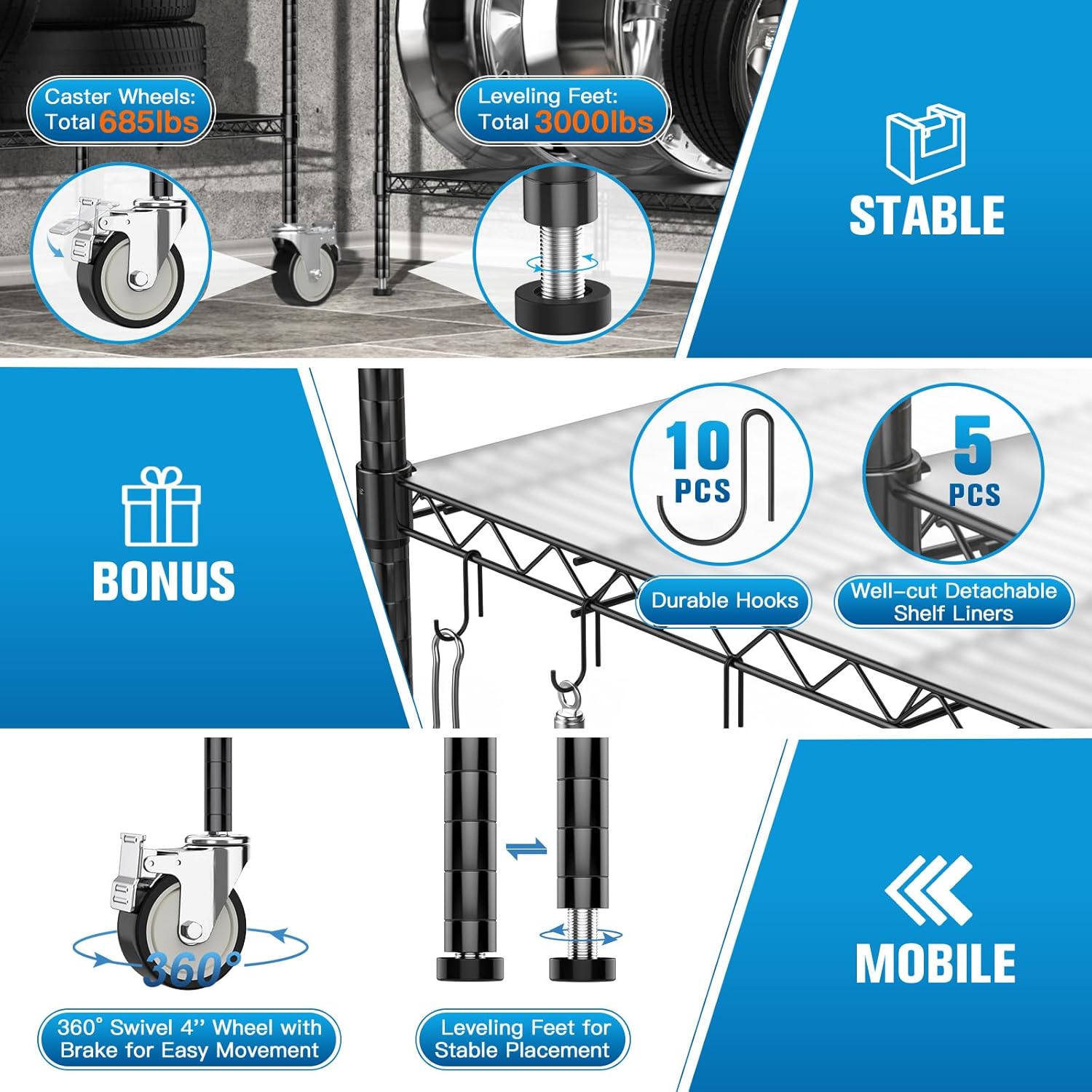 - LARGE STORAGE CAPACITY: Rolling shelf is very suitable for storing your food, pots and pans, books, tire, tool boxes, or other items. Measures 48 x 18 x 72 inch / 122 x 46 x 183 cm. 5 tier shelves design, equipped with 5 shelf liners, 10 S hooks, 4 leveling feet, 2 locking and 2 non-locking wheels. This wire shelving units is perfect for commercial multipurpose storage, solving your shelving worries and bid farewell to clutter