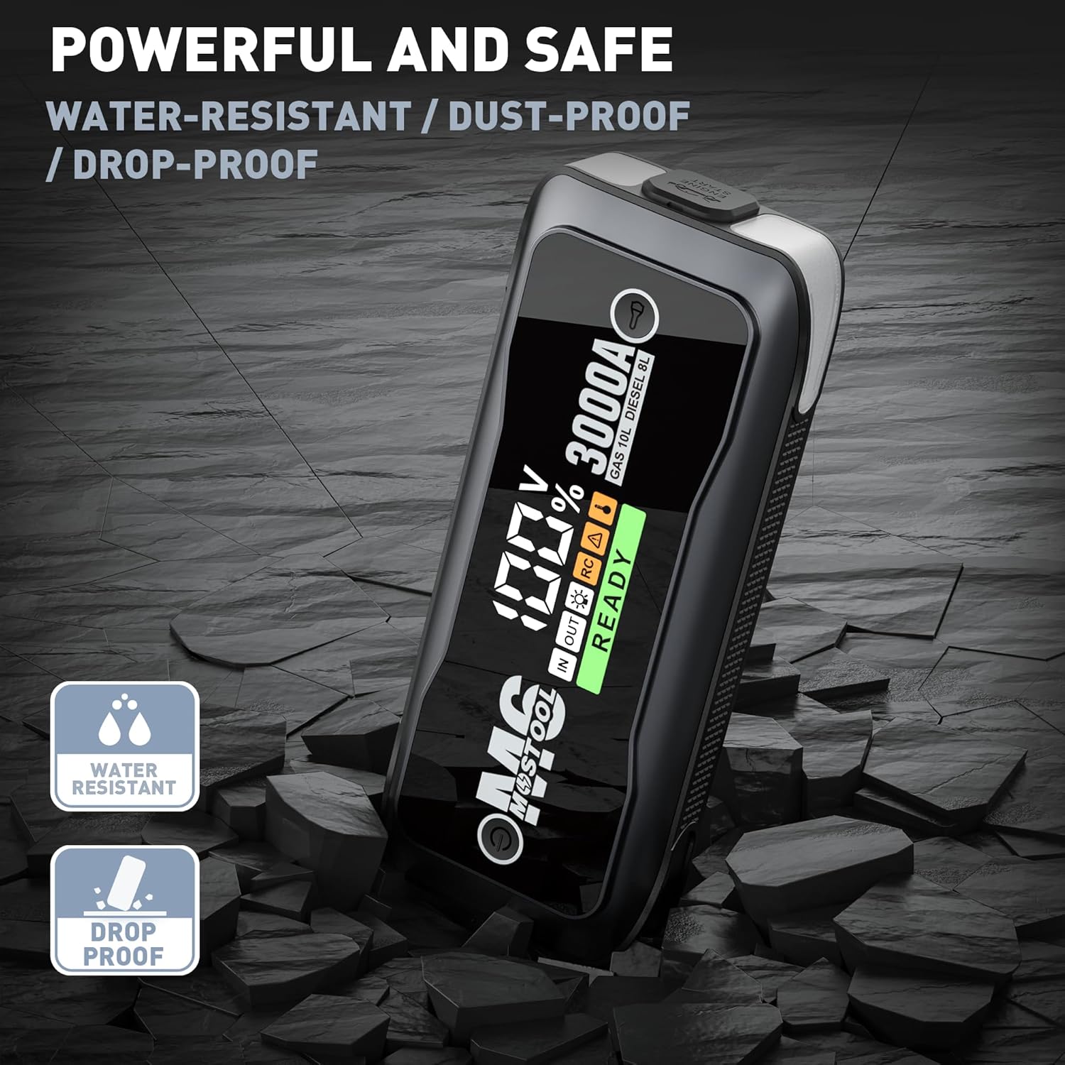 - 🚗【 Smarter Protection, Built-In】This lithium battery jump starter features a 4-inch display, built-in smart clamps, and 10 advanced safety protections including reverse polarity, short circuit, overcharge, and more. Unlike external modules, the integrated system offers safer, faster, and smarter operation. MOSTOOL M6 is the battery jumper starter portable users trust in critical moments