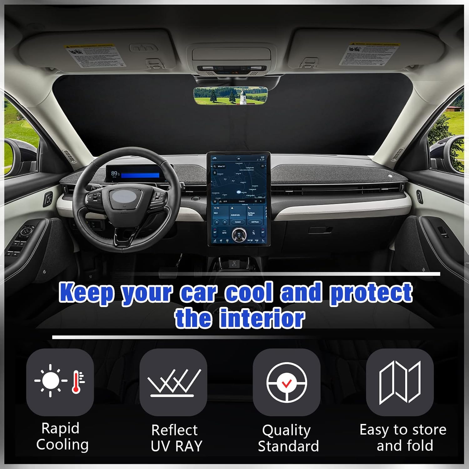 - 【Vehicle Specific】-Sze windshield sunshade specially designed for Ford Mustang Mach-E 2021 2022 2023 2024 2025. Full covered your windshield, No gap,100% perfect fit.