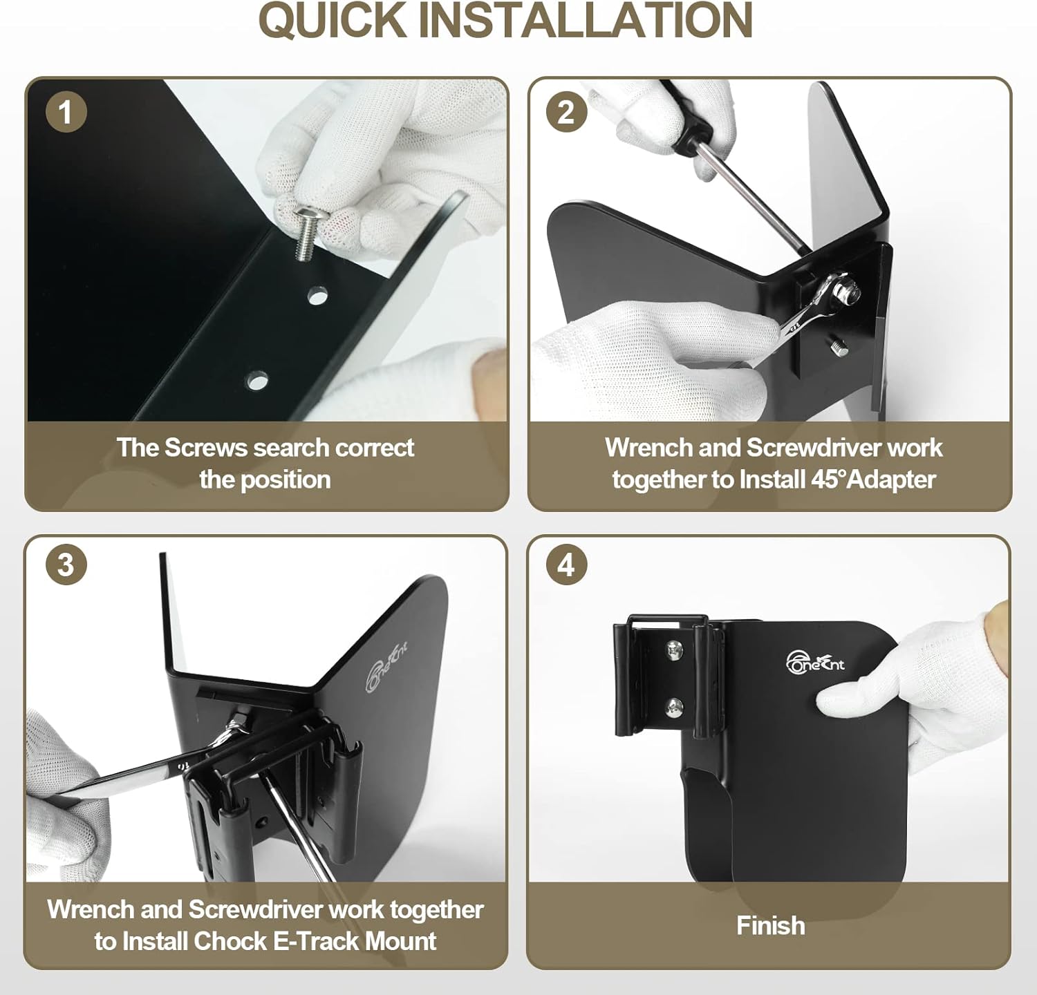 - Package Inclued:2 Pcs E-Track Wheel Chock, 2 Pcs Chock E-track mounts, 2 Pcs Tie-Down Ratchet Straps, 2 Pcs 45 Angle Adapte, 10 Pcs Screws and Nuts, 1 Pcs Wrench and 1 Pcs Screwdriver