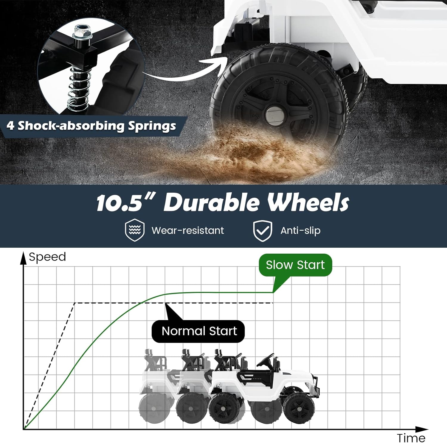 - Slow Start & Safety Design: This electric ride on truck is built for child’s safety with the seat belt and safe door locks. With the slow start function and 4 shock-absorbing springs on the anti-slip and durable wheels, this electric toy car will start at a slow speed and run smoothly on different roads.