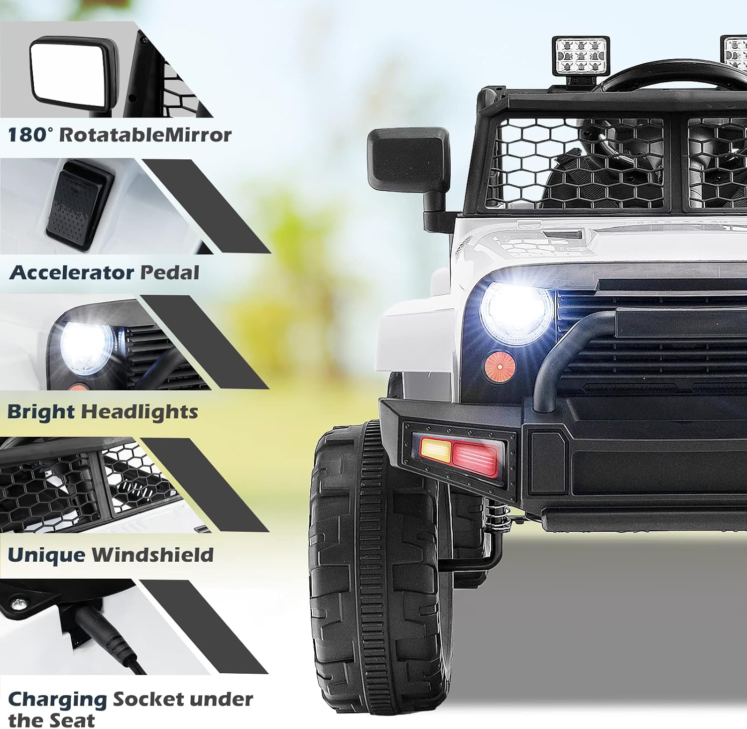 - Attractive with Cool Look: This kids electric vehicle toy features 180° rotatable mirrors and a unique windshield, which will appeal to your little one. Besides, the bright headlights not only make the car look cool, but also light the way ahead at night.