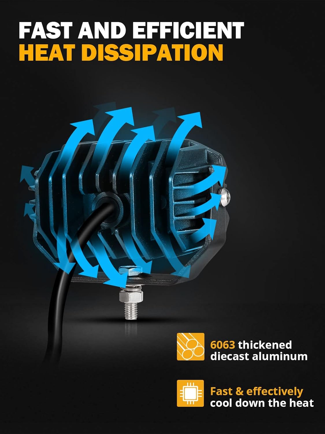 - 【High Intensity Chip】Auxbeam amber spot square light utilizes high-quality 5050 LED chips and a newly designed industrial 12D optical lens, delivering an efficient 60W light output and 6000LM for each pod, ensuring safe driving.