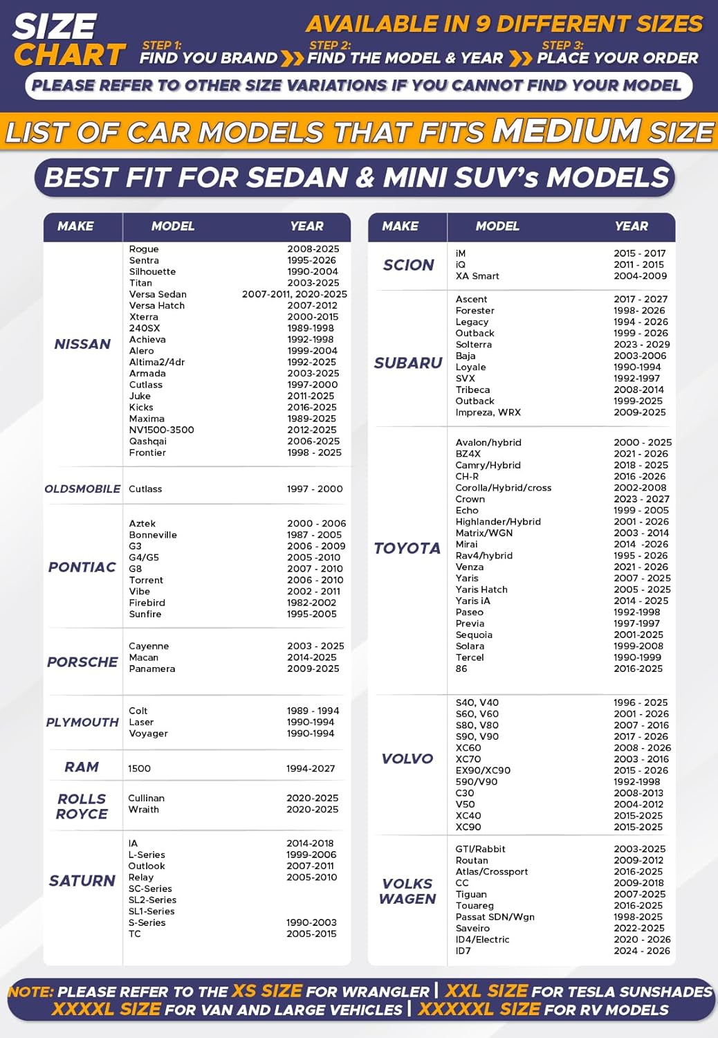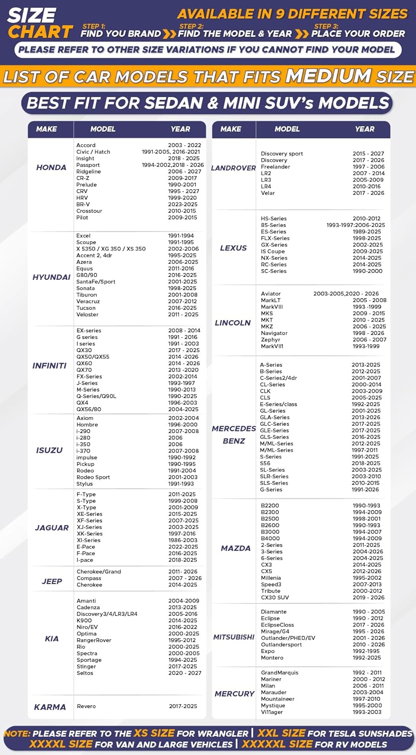 - Wide Range of Sizes for All Vehicles: EcoNour’s car window shades are available in seven size variants to suit sedans, SUVs, and family-sized vehicles. Refer to our size chart to select the ideal window sun blocker for your car's windshield.