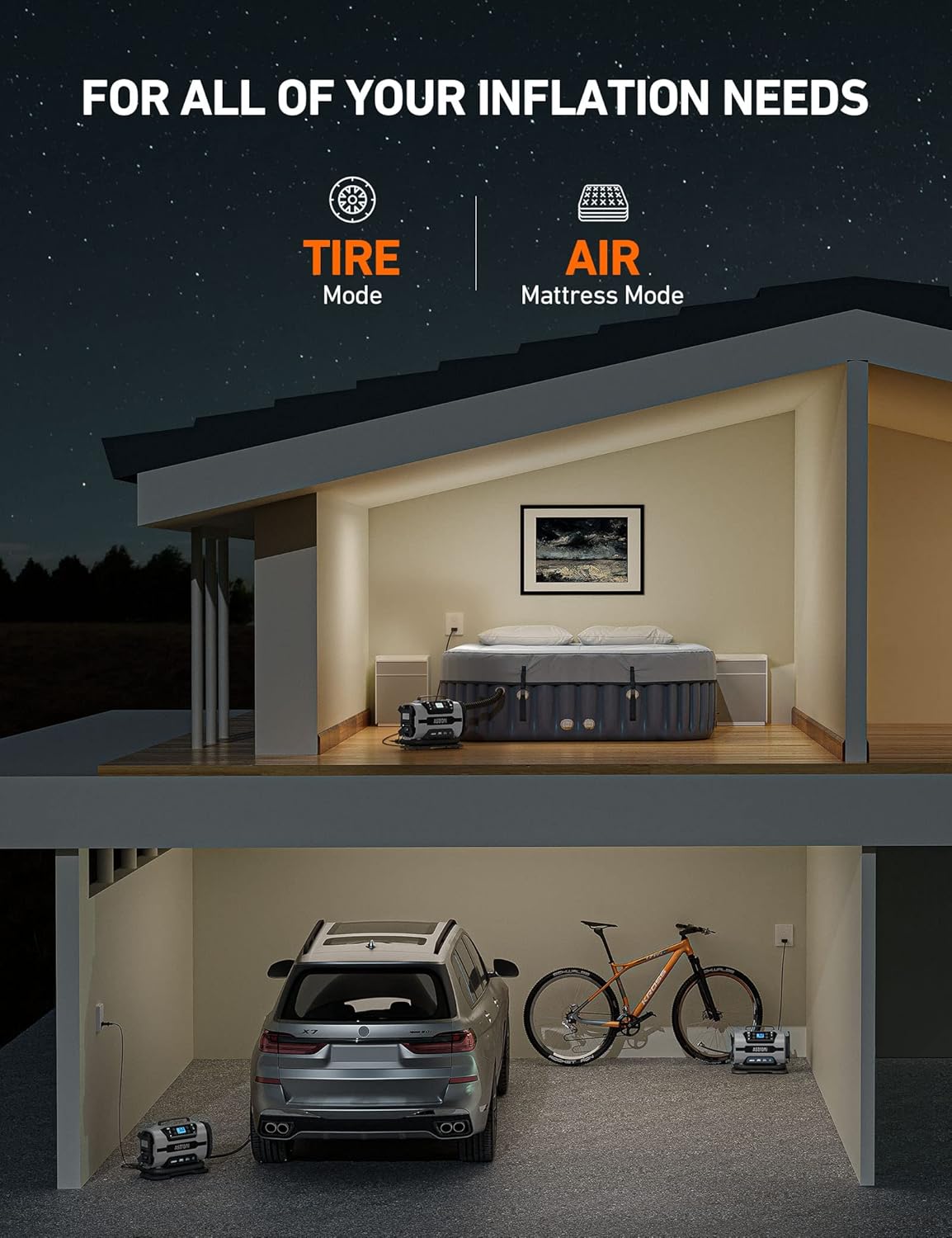 - Fast Inflation & 15-Minute Continuous Work: With dual metal motors and a metal cylinder, the tire inflator can continuously work for up to 15 mins. Large-volume mode provides a maximum inflation rate of 350 L/min, quickly inflating large items. High-pressure mode pumps up to 150 PSI, inflating a flat tire from 0 PSI to 36 PSI in 6 minutes. Compatible with cars, bikes, sedans and mid-sized SUVs. NOTE: This pump is incompatible with heavy-duty trucks.