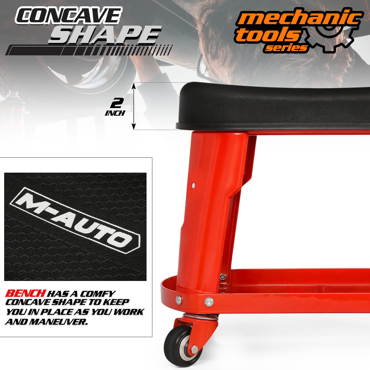M-AUTO Heavy Duty Garage Rolling Work Seat 300LBS Capacity Mechanics Stool with Wheels, Rolling Work Seat with Equipment Tray and Tool Rack, Rectangle Seat Mechanic Roll Chair, Red