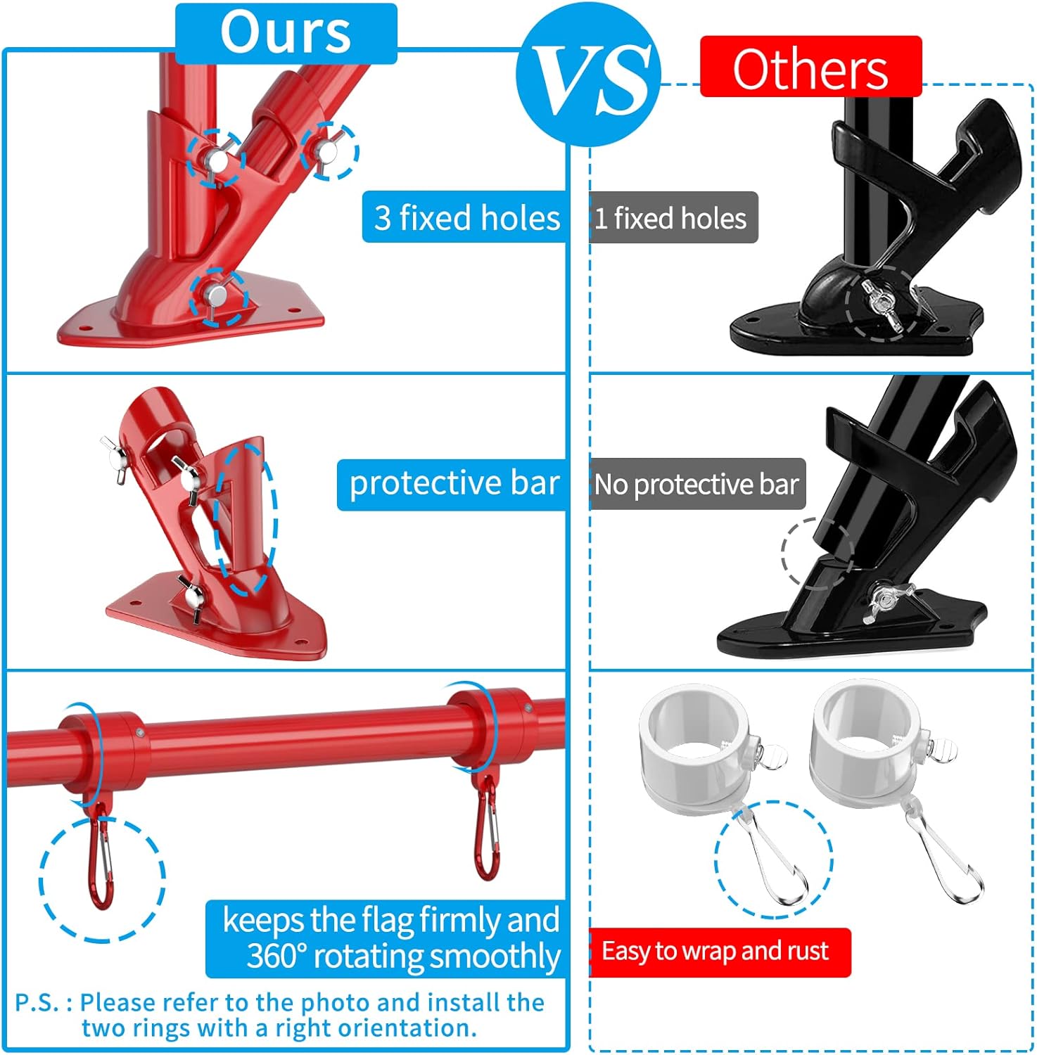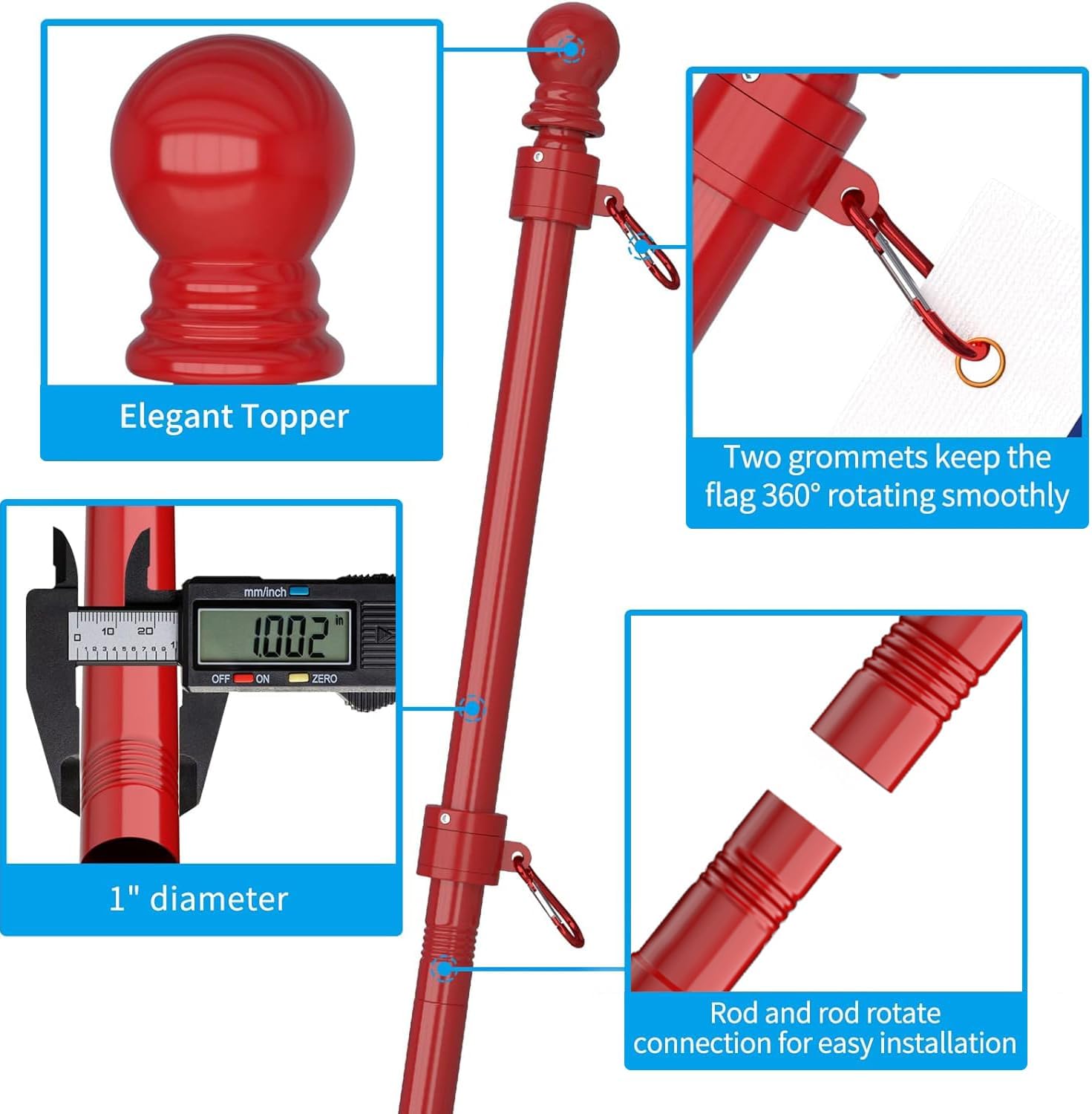 - Exquisite Design: 1*Flag Pole Diameter 1'', 1*Upgraded Bracket, 2*New Tangle Free Rings, 4*Carabiners, 1*Top Ball, 1*Installation Manual