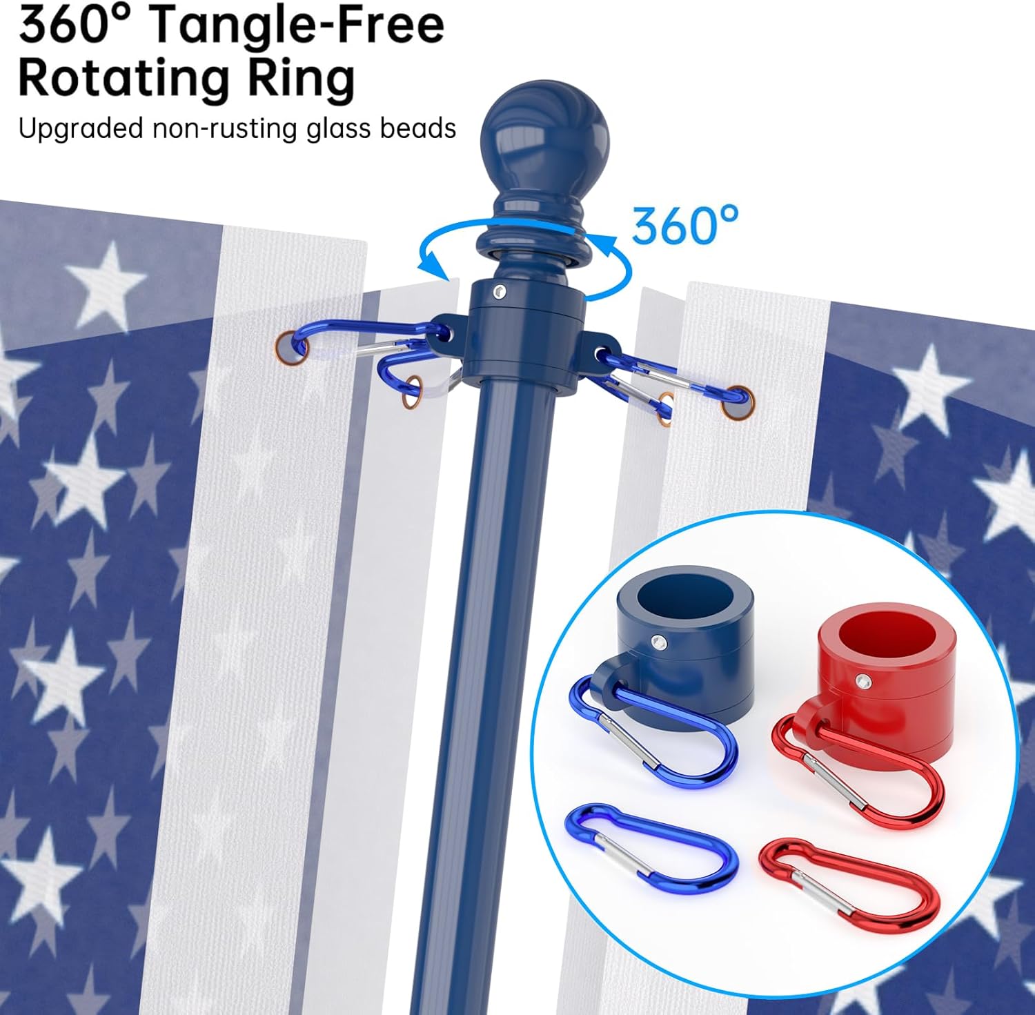 - Exquisite Design: 1*Flag Pole Diameter 1'', 1*Upgraded Bracket, 2*New Tangle Free Rings, 4*Carabiners, 1*Top Ball, 1*Installation Manual