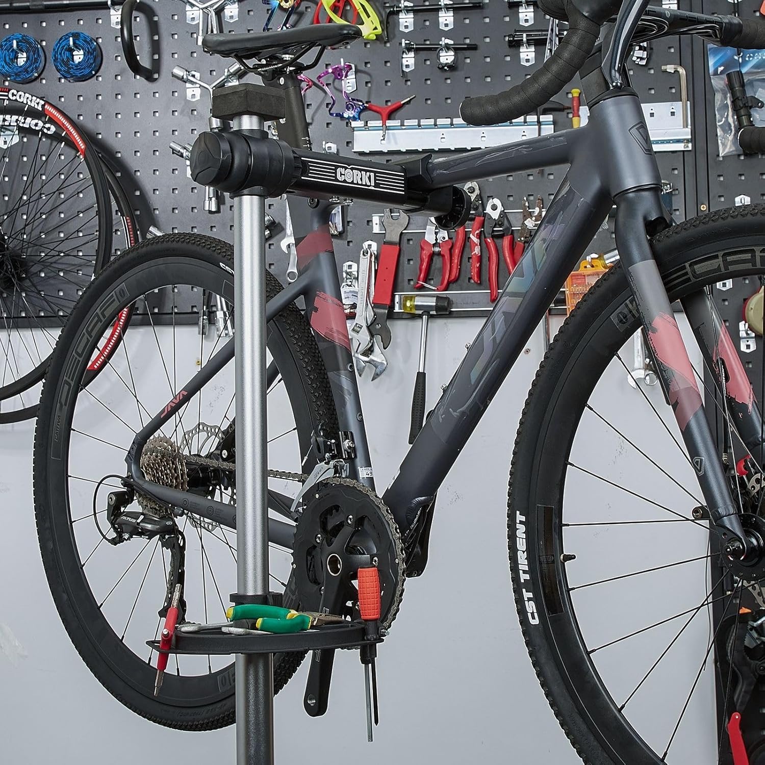 - ๐๐๐ซ๐ฌ๐๐ญ๐ข๐ฅ๐ - A versatile maintenance bike stand that is compatible with a range of bike styles and sizes is a valuable asset for any cyclist. Clamp and support your carbon fiber gravel bike or your downhill racing steed. Load the bike stand with your bike weighing up to 38kg. Use the Corki Cycles bike maintenance stand for all your bike's basic maintenance or even a full upgrade/overhaul. Our maintenance bike stand will last for years to come.