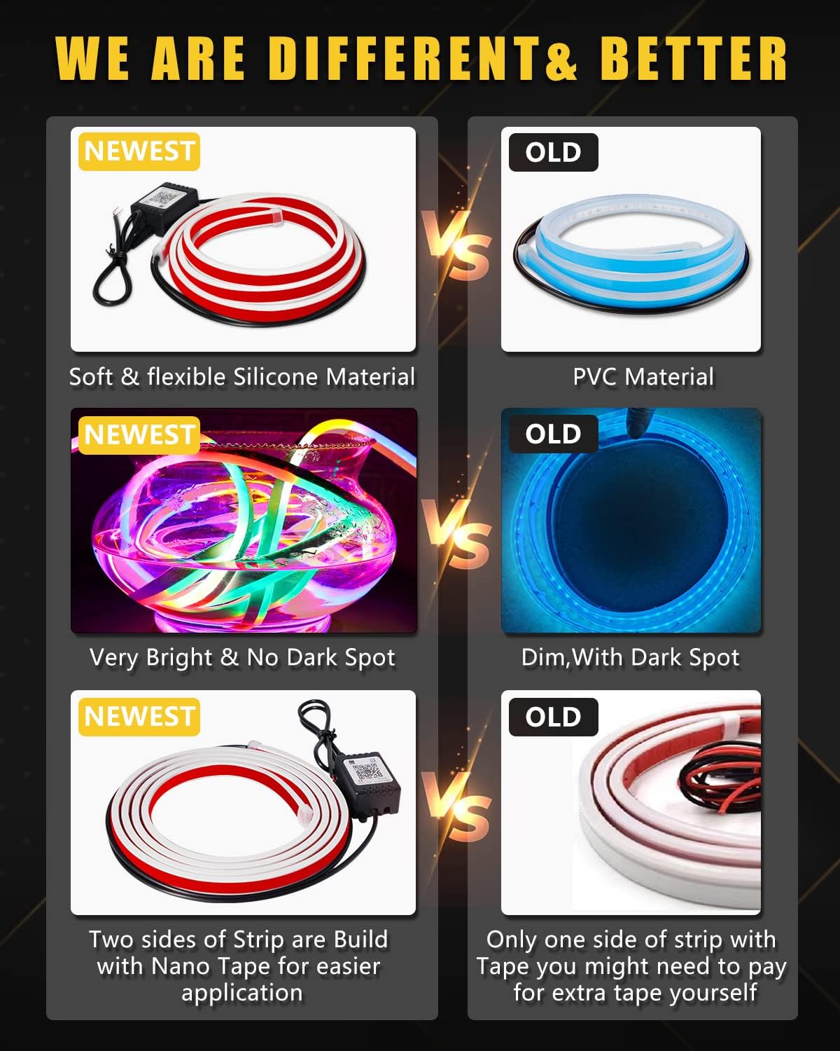 - Special Feature : Package includes one test pencil,one hot melt glue stick., Soft & Bright Light ,No Dark Spots, Two sides of Strip are Build with heavy duty Nano Tape, With 40 inches wire, With fuse tube for protection circuit Package includes one test pencil,one hot melt glue stick., Soft & Bright Light ,No Dark Spots, Two sides of Strip are Build with heavy duty Nano Tape, With 40 inches wire, With fuse tube for protection circuit