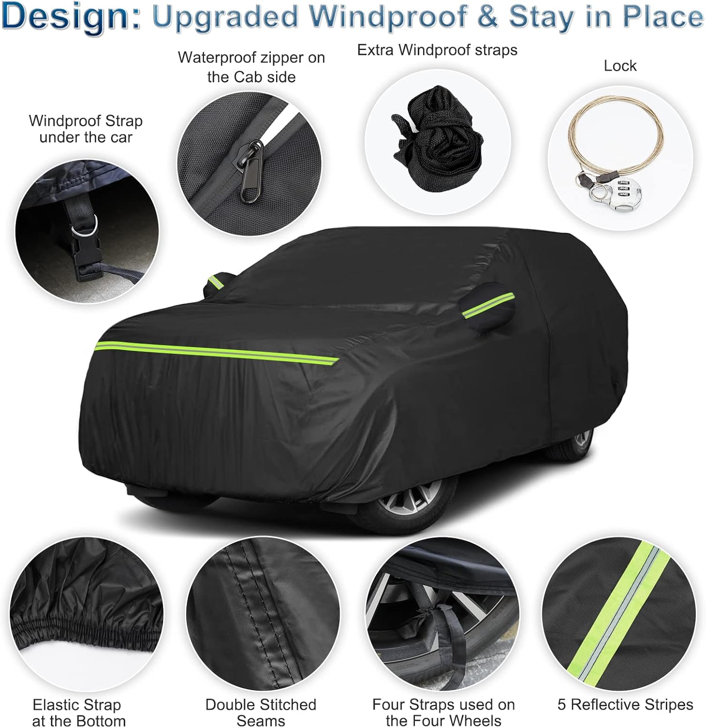 - 【Upgraded Windproof Design-Stay in Place】*1. Four straps used on the four wheels to make sure the cover stay in the place. *2. A windproof buckle pass through the middle of the car. *3. Elastic Strap at the bottom of front and rear to ensure cover fit your car and to protect your car cover from blowing off, even in heavy wind. *4.Elasticized hem and fixed buckles: against to strong wind,Four straps used on the four wheels to make sure the cover stay in the place.