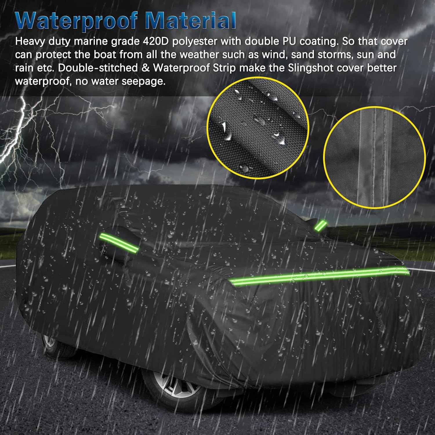 - 【Designs with Zipper】A zipper on the cab side for convenience. UV protection and heat-proof .5 Reflective Strips attached on the front DRL lamps, middle Turning lights and Rear taillight.It comes with four straps,a windproof buckle, a security lock and a storage bag.Mirror Pocket: protect rear view mirror in all directions.(6)Double-stitched & Waterproof Strip make the cover better waterproof.