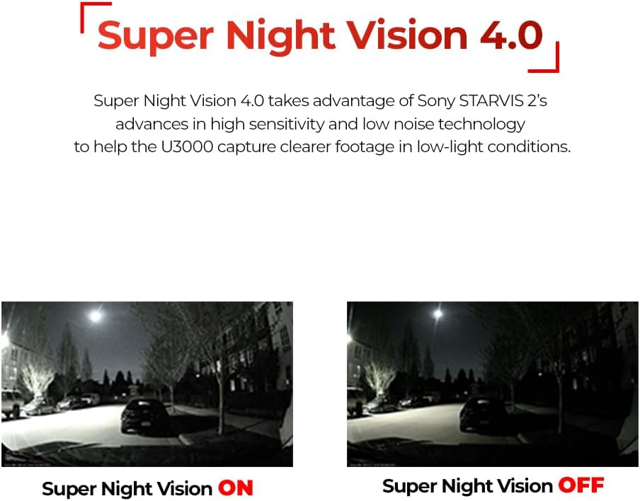 - Special Feature : 4K STARVIS 2 Sensor + Ambarella CPU: Captures ultra‑clear 4K detail with Sony STARVIS 2 and a high‑performance processor, while adjustable bitrate preserves critical evidence like license plates., Built‑in Front & Rear Radar Parking Mode: Low‑power radars detect motion and wake the camera to save a 20‑second clip, extending parked protection without draining your battery (hardwiring or OBD‑II cable required)., Event‑Ready Motion & Impact Capture: Records a 20‑second event file with 10 seconds before and after the trigger so you capture the full context., Lifelike Image Processing (WDR, Smart Auto‑Exposure, Dewarping): Automatically balances harsh highlights and deep shadows while minimizing fisheye distortion for a natural, true‑to‑road view., Super Night Vision 4.0: Advanced sensitivity and low‑noise processing brighten night scenes and reduce grain so low‑light footage stays clear and usable. 4K STARVIS 2 Sensor + Ambarella CPU: Captures ultra‑clear 4K detail with Sony STARVIS 2 and a high‑performance processor, while adjustable bitrate preserves critical evidence like license plates., Built… See more